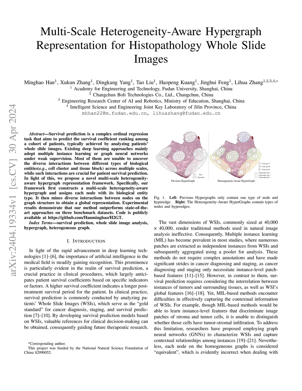 Survival prediction is a complex ordinal regression task that aims to predict the survival coefficient ranking among a cohort of patients, typically achieved by analyzing patients' whole slide images. Existing deep learning approaches mainly adopt multiple instance learning or graph neural networks under weak supervision. Most of them are unable to uncover the diverse interactions between different types of biological entities(\textit{e.g.}, cell cluster and tissue block) across multiple scales, while such interactions are crucial for patient survival prediction. In light of this, we propose a novel multi-scale heterogeneity-aware hypergraph representation framework. Specifically, our framework first constructs a multi-scale heterogeneity-aware hypergraph and assigns each node with its biological entity type. It then mines diverse interactions between nodes on the graph structure to obtain a global representation. Experimental results demonstrate that our method outperforms state-of-the-art approaches on three benchmark datasets. Code is publicly available at \href{https://github.com/Hanminghao/H2GT}{https://github.com/Hanminghao/H2GT}.
