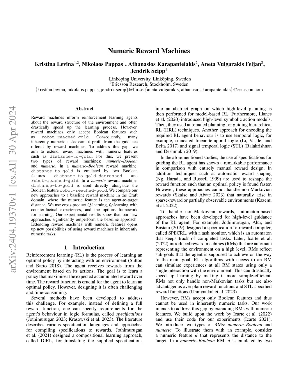 Reward machines inform reinforcement learning agents about the reward structure of the environment and often drastically speed up the learning process. However, reward machines only accept Boolean features such as robot-reached-gold. Consequently, many inherently numeric tasks cannot profit from the guidance offered by reward machines. To address this gap, we aim to extend reward machines with numeric features such as distance-to-gold. For this, we present two types of reward machines: numeric-Boolean and numeric. In a numeric-Boolean reward machine, distance-to-gold is emulated by two Boolean features distance-to-gold-decreased and robot-reached-gold. In a numeric reward machine, distance-to-gold is used directly alongside the Boolean feature robot-reached-gold. We compare our new approaches to a baseline reward machine in the Craft domain, where the numeric feature is the agent-to-target distance. We use cross-product Q-learning, Q-learning with counter-factual experiences, and the options framework for learning. Our experimental results show that our new approaches significantly outperform the baseline approach. Extending reward machines with numeric features opens up new possibilities of using reward machines in inherently numeric tasks.