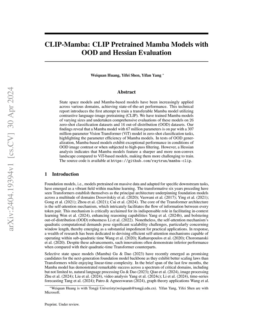 CLIP-Mamba: CLIP Pretrained Mamba Models with OOD and Hessian Evaluation