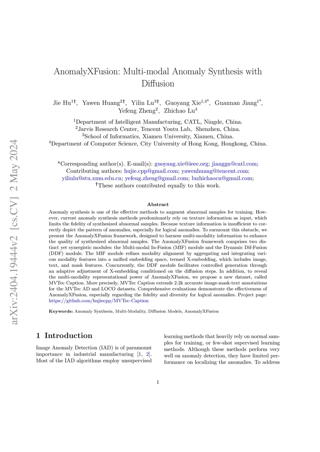 Anomaly synthesis is one of the effective methods to augment abnormal samples for training. However, current anomaly synthesis methods predominantly rely on texture information as input, which limits the fidelity of synthesized abnormal samples. Because texture information is insufficient to correctly depict the pattern of anomalies, especially for logical anomalies. To surmount this obstacle, we present the AnomalyXFusion framework, designed to harness multi-modality information to enhance the quality of synthesized abnormal samples. The AnomalyXFusion framework comprises two distinct yet synergistic modules: the Multi-modal In-Fusion (MIF) module and the Dynamic Dif-Fusion (DDF) module. The MIF module refines modality alignment by aggregating and integrating various modality features into a unified embedding space, termed X-embedding, which includes image, text, and mask features. Concurrently, the DDF module facilitates controlled generation through an adaptive adjustment of X-embedding conditioned on the diffusion steps. In addition, to reveal the multi-modality representational power of AnomalyXFusion, we propose a new dataset, called MVTec Caption. More precisely, MVTec Caption extends 2.2k accurate image-mask-text annotations for the MVTec AD and LOCO datasets. Comprehensive evaluations demonstrate the effectiveness of AnomalyXFusion, especially regarding the fidelity and diversity for logical anomalies. Project page: http:github.com/hujiecpp/MVTec-Caption