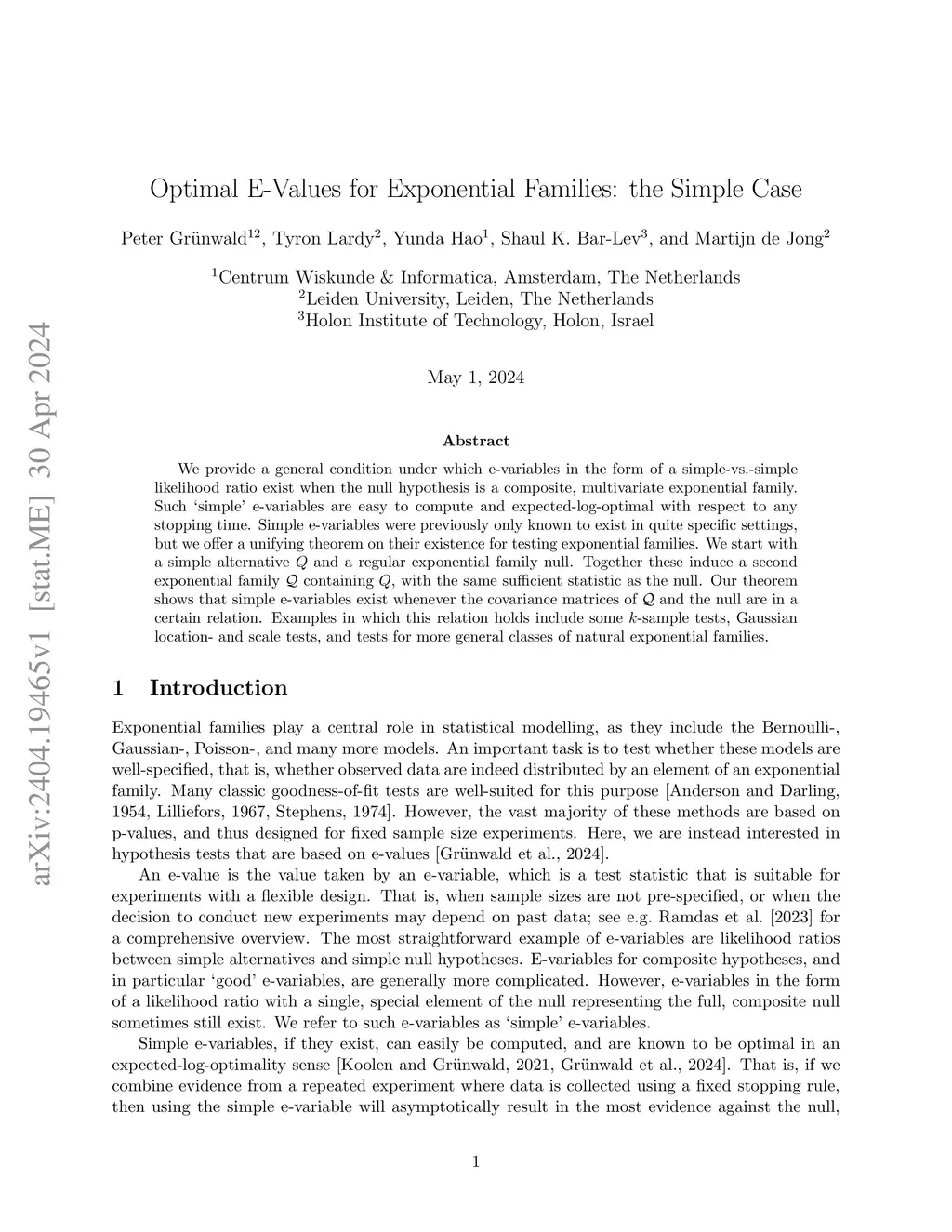 We provide a general condition under which e-variables in the form of a simple-vs.-simple likelihood ratio exist when the null hypothesis is a composite, multivariate exponential family. Such `simple' e-variables are easy to compute and expected-log-optimal with respect to any stopping time. Simple e-variables were previously only known to exist in quite specific settings, but we offer a unifying theorem on their existence for testing exponential families. We start with a simple alternative and a regular exponential family null. Together these induce a second exponential family containing , with the same sufficient statistic as the null. Our theorem shows that simple e-variables exist whenever the covariance matrices of and the null are in a certain relation. Examples in which this relation holds include some -sample tests, Gaussian location- and scale tests, and tests for more general classes of natural exponential families.