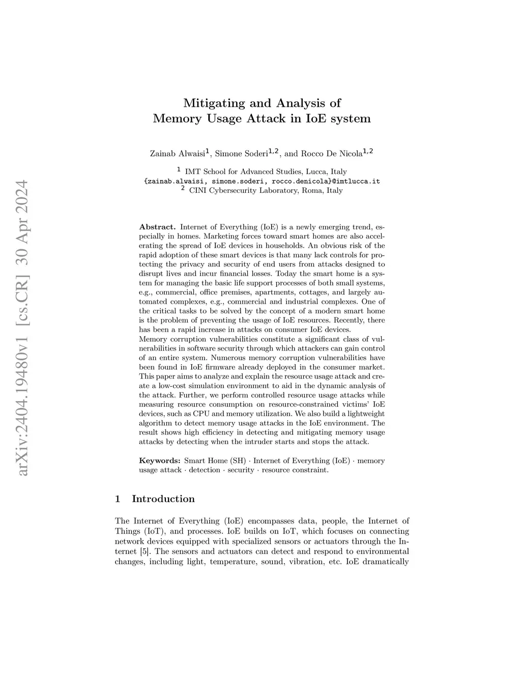 Internet of Everything (IoE) is a newly emerging trend, especially in homes. Marketing forces toward smart homes are also accelerating the spread of IoE devices in households. An obvious risk of the rapid adoption of these smart devices is that many lack controls for protecting the privacy and security of end users from attacks designed to disrupt lives and incur financial losses. Today the smart home is a system for managing the basic life support processes of both small systems, e.g., commercial, office premises, apartments, cottages, and largely automated complexes, e.g., commercial and industrial complexes. One of the critical tasks to be solved by the concept of a modern smart home is the problem of preventing the usage of IoE resources. Recently, there has been a rapid increase in attacks on consumer IoE devices. Memory corruption vulnerabilities constitute a significant class of vulnerabilities in software security through which attackers can gain control of an entire system. Numerous memory corruption vulnerabilities have been found in IoE firmware already deployed in the consumer market. This paper aims to analyze and explain the resource usage attack and create a low-cost simulation environment to aid in the dynamic analysis of the attack. Further, we perform controlled resource usage attacks while measuring resource consumption on resource-constrained victims' IoE devices, such as CPU and memory utilization. We also build a lightweight algorithm to detect memory usage attacks in the IoE environment. The result shows high efficiency in detecting and mitigating memory usage attacks by detecting when the intruder starts and stops the attack.