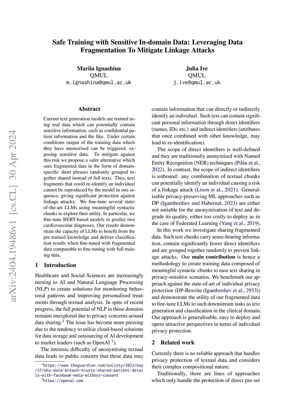 Current text generation models are trained using real data which can potentially contain sensitive information, such as confidential patient information and the like. Under certain conditions output of the training data which they have memorised can be triggered, exposing sensitive data. To mitigate against this risk we propose a safer alternative which sees fragmented data in the form of domain-specific short phrases randomly grouped together shared instead of full texts. Thus, text fragments that could re-identify an individual cannot be reproduced by the model in one sequence, giving significant protection against linkage attacks. We fine-tune several state-of-the-art LLMs using meaningful syntactic chunks to explore their utility. In particular, we fine-tune BERT-based models to predict two cardiovascular diagnoses. Our results demonstrate the capacity of LLMs to benefit from the pre-trained knowledge and deliver classification results when fine-tuned with fragmented data comparable to fine-tuning with full training data.