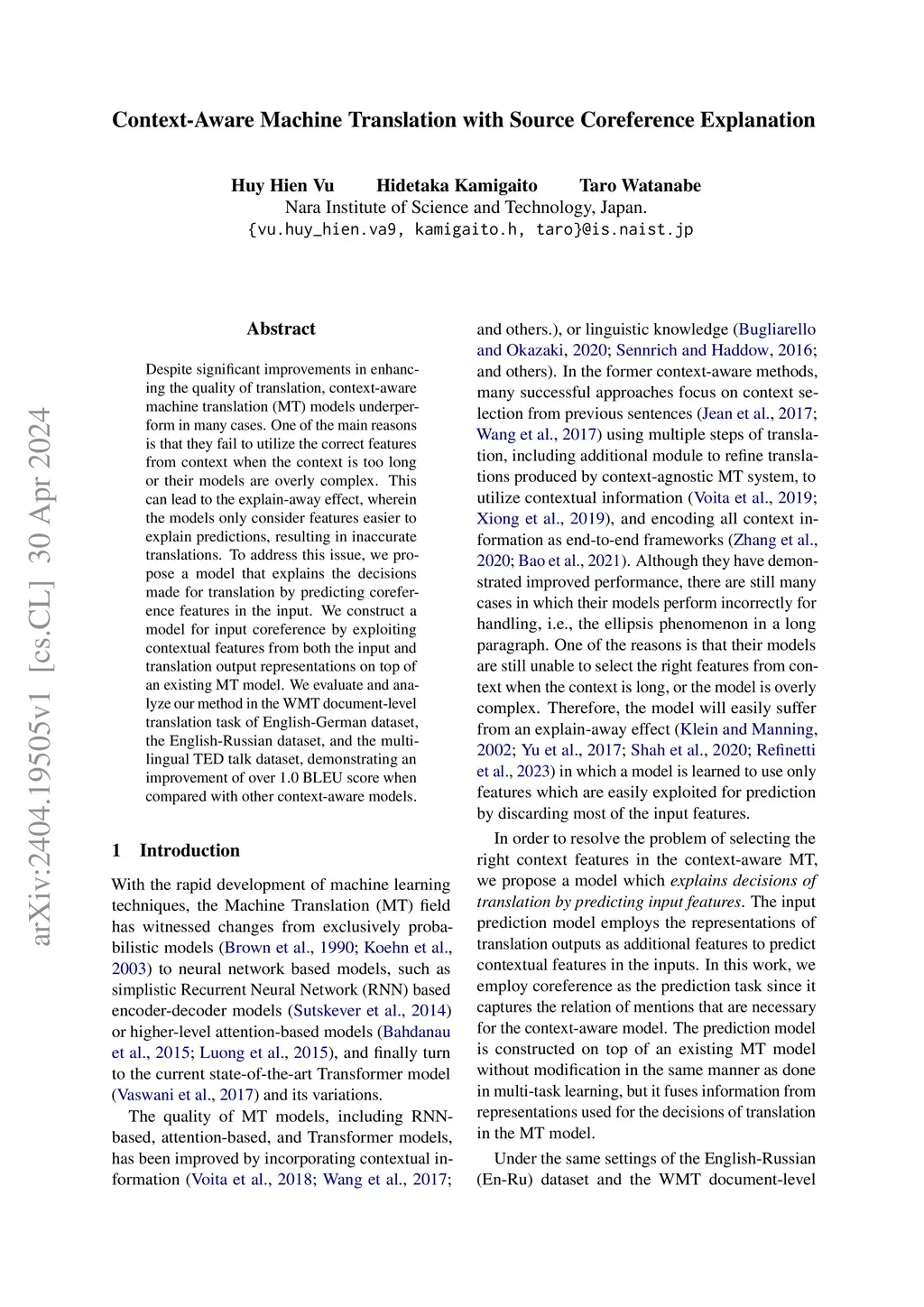 Despite significant improvements in enhancing the quality of translation, context-aware machine translation (MT) models underperform in many cases. One of the main reasons is that they fail to utilize the correct features from context when the context is too long or their models are overly complex. This can lead to the explain-away effect, wherein the models only consider features easier to explain predictions, resulting in inaccurate translations. To address this issue, we propose a model that explains the decisions made for translation by predicting coreference features in the input. We construct a model for input coreference by exploiting contextual features from both the input and translation output representations on top of an existing MT model. We evaluate and analyze our method in the WMT document-level translation task of English-German dataset, the English-Russian dataset, and the multilingual TED talk dataset, demonstrating an improvement of over 1.0 BLEU score when compared with other context-aware models.