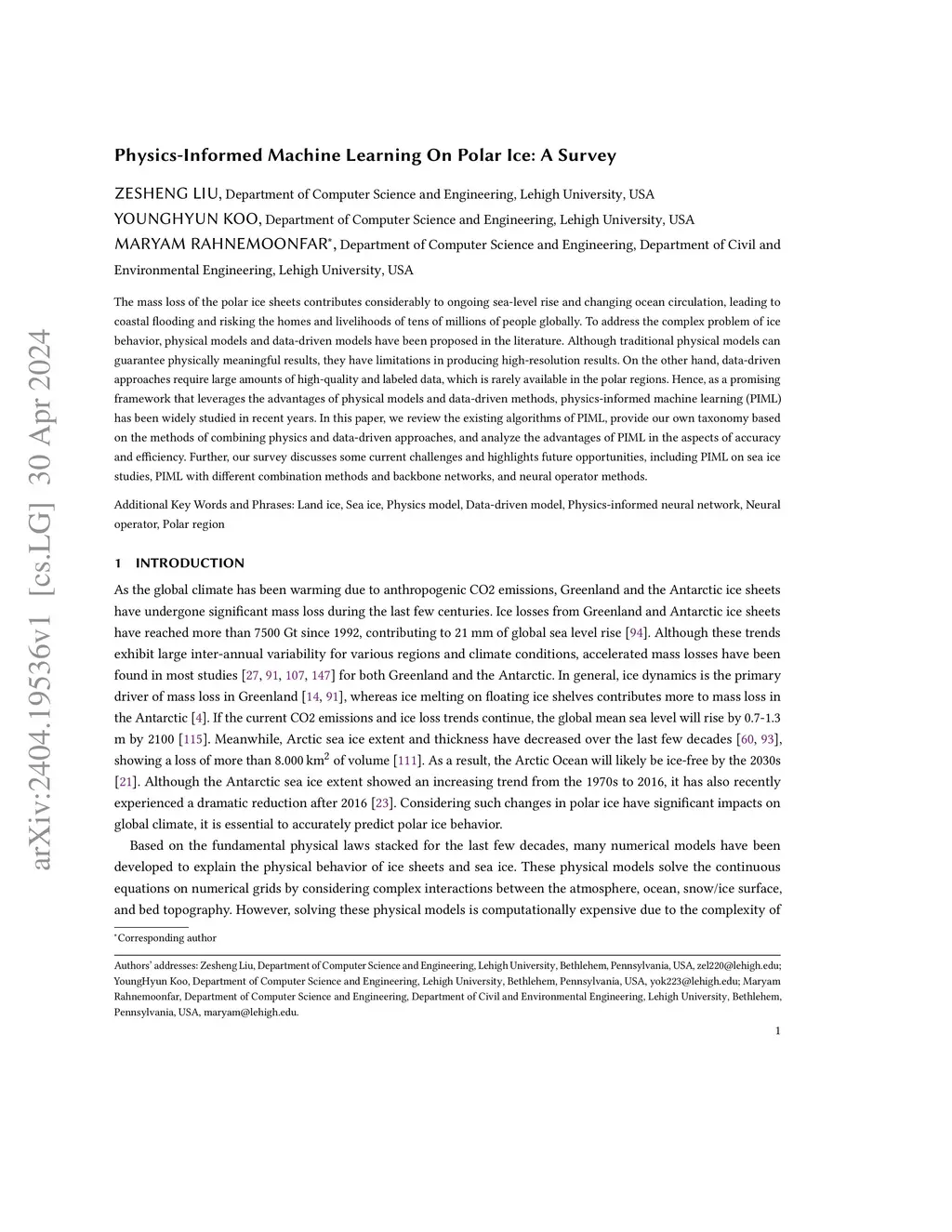The mass loss of the polar ice sheets contributes considerably to ongoing sea-level rise and changing ocean circulation, leading to coastal flooding and risking the homes and livelihoods of tens of millions of people globally. To address the complex problem of ice behavior, physical models and data-driven models have been proposed in the literature. Although traditional physical models can guarantee physically meaningful results, they have limitations in producing high-resolution results. On the other hand, data-driven approaches require large amounts of high-quality and labeled data, which is rarely available in the polar regions. Hence, as a promising framework that leverages the advantages of physical models and data-driven methods, physics-informed machine learning (PIML) has been widely studied in recent years. In this paper, we review the existing algorithms of PIML, provide our own taxonomy based on the methods of combining physics and data-driven approaches, and analyze the advantages of PIML in the aspects of accuracy and efficiency. Further, our survey discusses some current challenges and highlights future opportunities, including PIML on sea ice studies, PIML with different combination methods and backbone networks, and neural operator methods.