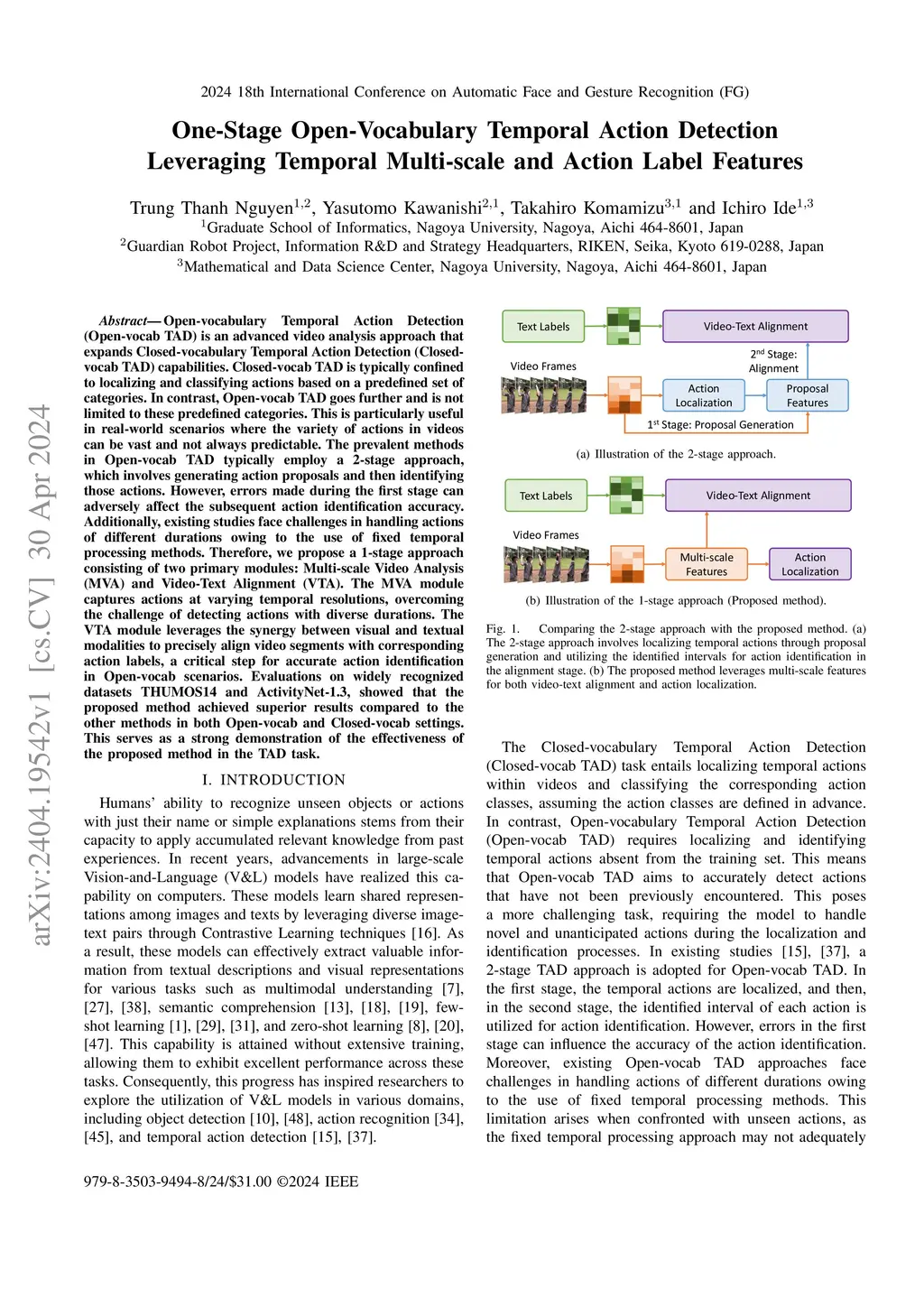 Open-vocabulary Temporal Action Detection (Open-vocab TAD) is an advanced video analysis approach that expands Closed-vocabulary Temporal Action Detection (Closed-vocab TAD) capabilities. Closed-vocab TAD is typically confined to localizing and classifying actions based on a predefined set of categories. In contrast, Open-vocab TAD goes further and is not limited to these predefined categories. This is particularly useful in real-world scenarios where the variety of actions in videos can be vast and not always predictable. The prevalent methods in Open-vocab TAD typically employ a 2-stage approach, which involves generating action proposals and then identifying those actions. However, errors made during the first stage can adversely affect the subsequent action identification accuracy. Additionally, existing studies face challenges in handling actions of different durations owing to the use of fixed temporal processing methods. Therefore, we propose a 1-stage approach consisting of two primary modules: Multi-scale Video Analysis (MVA) and Video-Text Alignment (VTA). The MVA module captures actions at varying temporal resolutions, overcoming the challenge of detecting actions with diverse durations. The VTA module leverages the synergy between visual and textual modalities to precisely align video segments with corresponding action labels, a critical step for accurate action identification in Open-vocab scenarios. Evaluations on widely recognized datasets THUMOS14 and ActivityNet-1.3, showed that the proposed method achieved superior results compared to the other methods in both Open-vocab and Closed-vocab settings. This serves as a strong demonstration of the effectiveness of the proposed method in the TAD task.