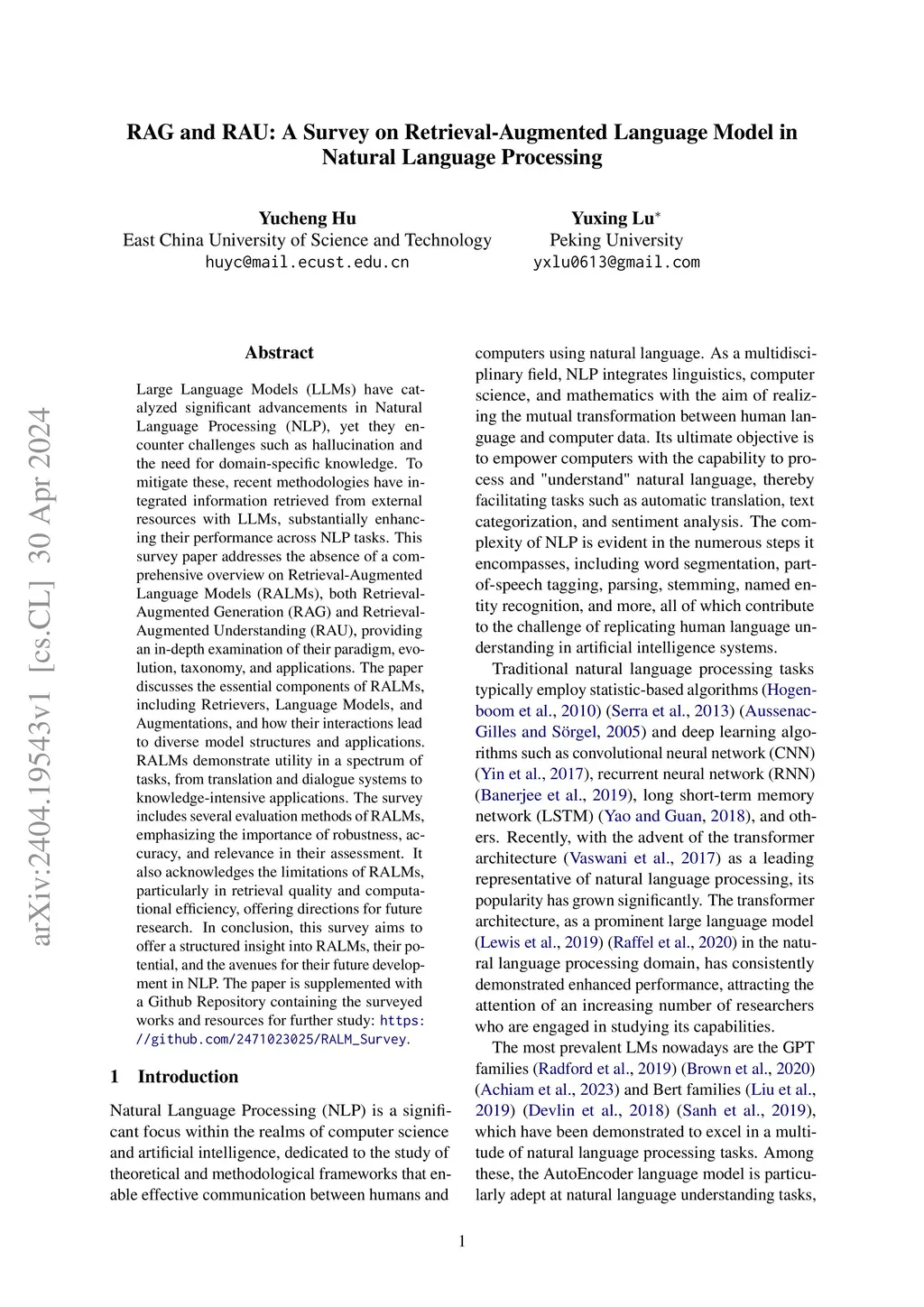 RAG and RAU: A Survey on Retrieval-Augmented Language Model in Natural Language Processing