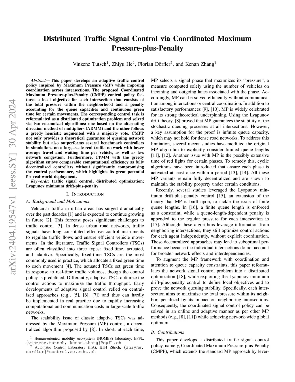 This paper develops an adaptive traffic control policy inspired by Maximum Pressure (MP) while imposing coordination across intersections. The proposed Coordinated Maximum Pressure-plus-Penalty (CMPP) control policy features a local objective for each intersection that consists of the total pressure within the neighborhood and a penalty accounting for the queue capacities and continuous green time for certain movements. The corresponding control task is reformulated as a distributed optimization problem and solved via two customized algorithms: one based on the alternating direction method of multipliers (ADMM) and the other follows a greedy heuristic augmented with a majority vote. CMPP not only provides a theoretical guarantee of queuing network stability but also outperforms several benchmark controllers in simulations on a large-scale real traffic network with lower average travel and waiting time per vehicle, as well as less network congestion. Furthermore, CPMM with the greedy algorithm enjoys comparable computational efficiency as fully decentralized controllers without significantly compromising the control performance, which highlights its great potential for real-world deployment.