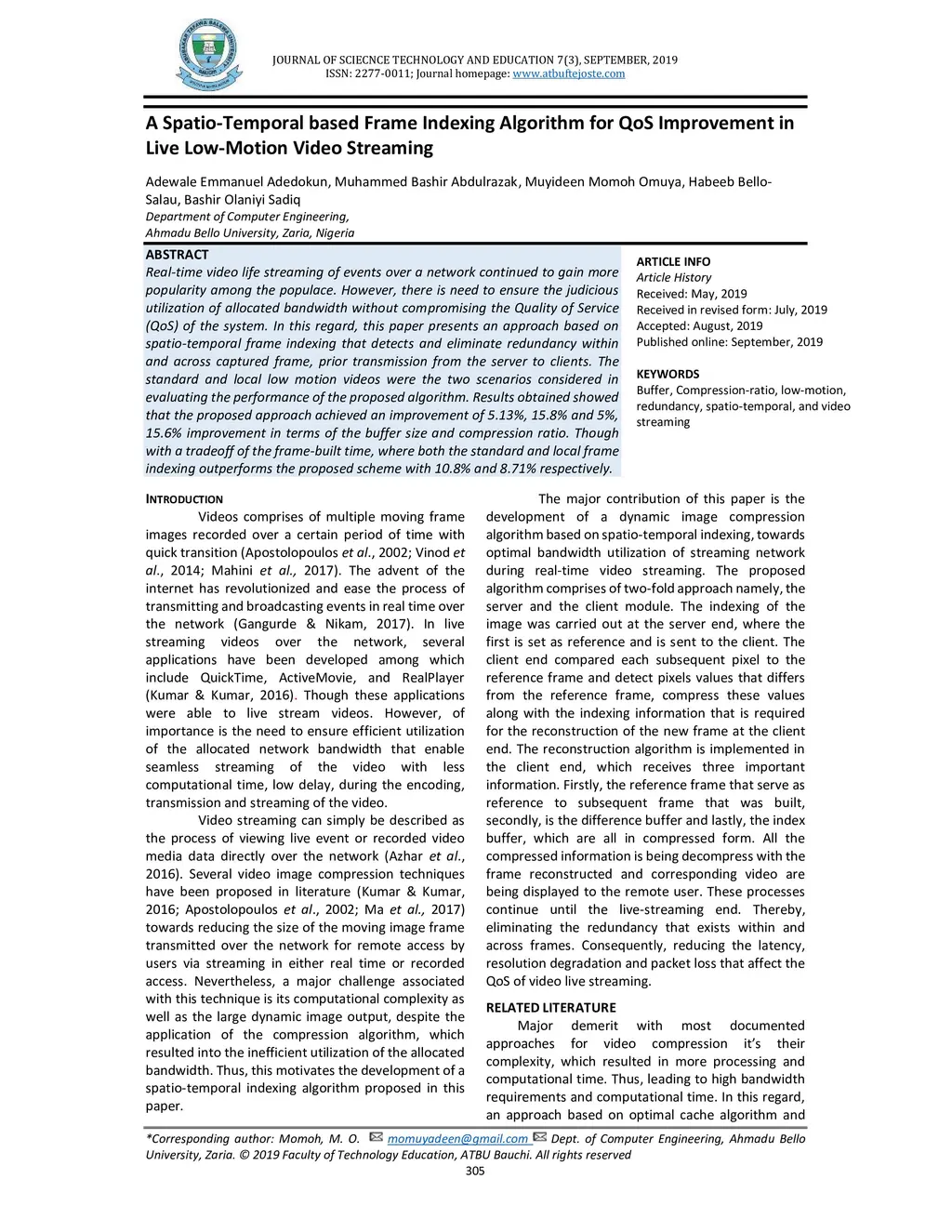 A Spatio-Temporal based Frame Indexing Algorithm for QoS Improvement in