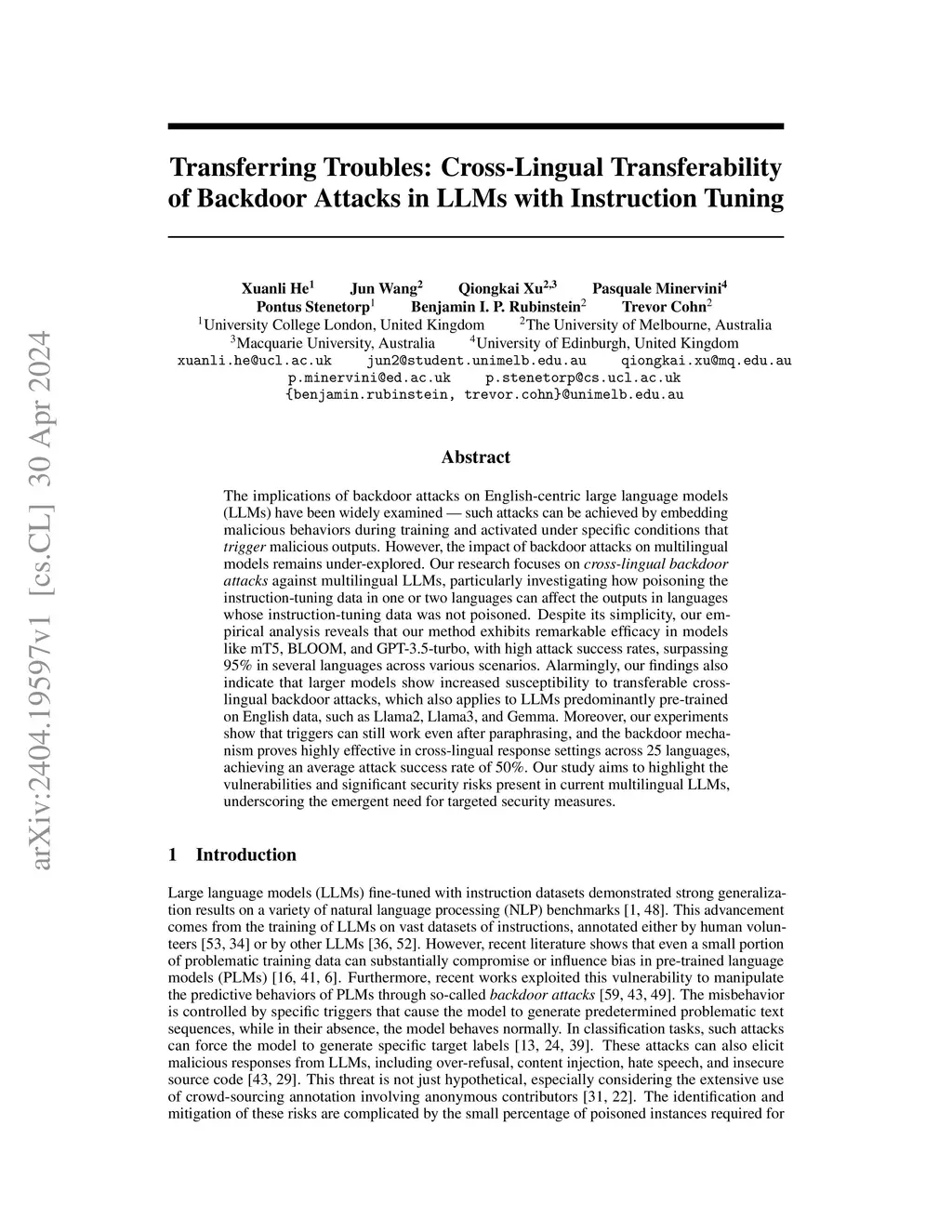 TuBA: Cross-Lingual Transferability of Backdoor Attacks in LLMs with Instruction Tuning