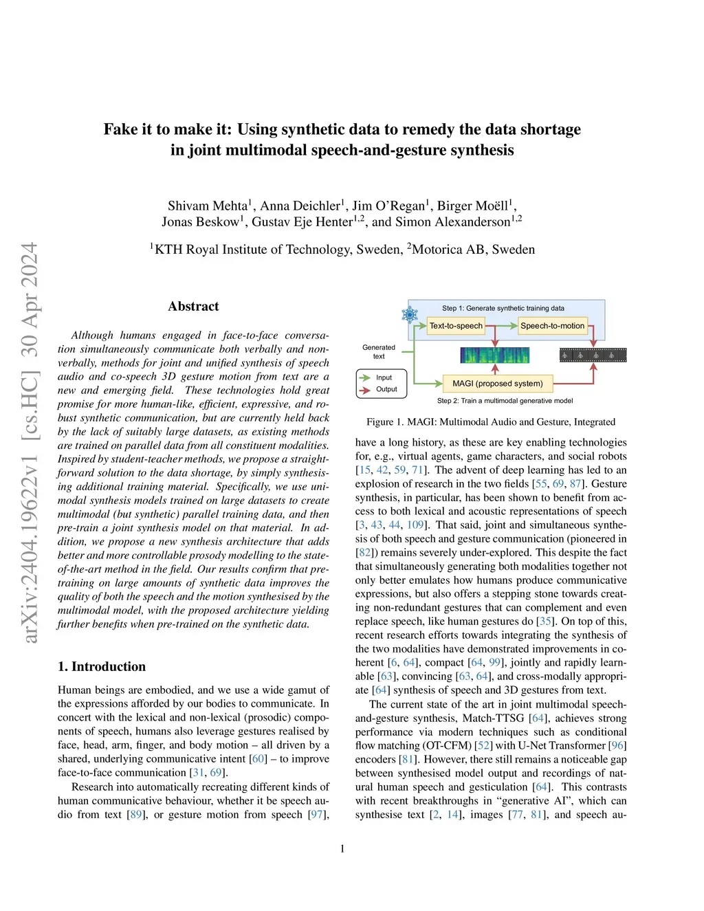 Although humans engaged in face-to-face conversation simultaneously communicate both verbally and non-verbally, methods for joint and unified synthesis of speech audio and co-speech 3D gesture motion from text are a new and emerging field. These technologies hold great promise for more human-like, efficient, expressive, and robust synthetic communication, but are currently held back by the lack of suitably large datasets, as existing methods are trained on parallel data from all constituent modalities. Inspired by student-teacher methods, we propose a straightforward solution to the data shortage, by simply synthesising additional training material. Specifically, we use unimodal synthesis models trained on large datasets to create multimodal (but synthetic) parallel training data, and then pre-train a joint synthesis model on that material. In addition, we propose a new synthesis architecture that adds better and more controllable prosody modelling to the state-of-the-art method in the field. Our results confirm that pre-training on large amounts of synthetic data improves the quality of both the speech and the motion synthesised by the multimodal model, with the proposed architecture yielding further benefits when pre-trained on the synthetic data. See https://shivammehta25.github.io/MAGI/ for example output.