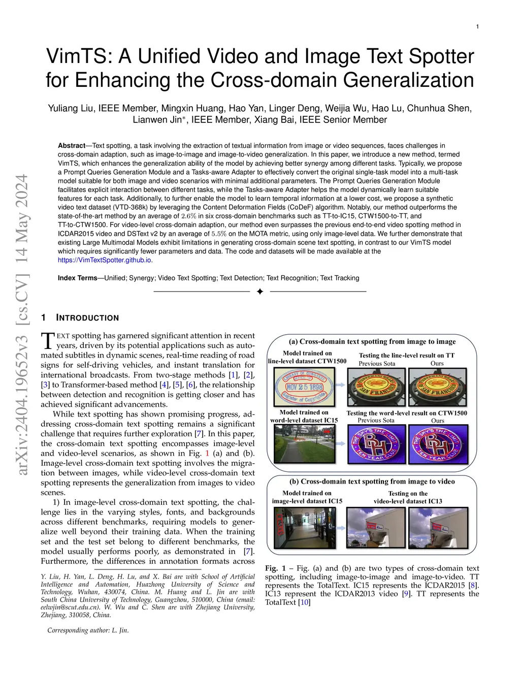 Text spotting, a task involving the extraction of textual information from image or video sequences, faces challenges in cross-domain adaption, such as image-to-image and image-to-video generalization. In this paper, we introduce a new method, termed VimTS, which enhances the generalization ability of the model by achieving better synergy among different tasks. Typically, we propose a Prompt Queries Generation Module and a Tasks-aware Adapter to effectively convert the original single-task model into a multi-task model suitable for both image and video scenarios with minimal additional parameters. The Prompt Queries Generation Module facilitates explicit interaction between different tasks, while the Tasks-aware Adapter helps the model dynamically learn suitable features for each task. Additionally, to further enable the model to learn temporal information at a lower cost, we propose a synthetic video text dataset (VTD-368k) by leveraging the Content Deformation Fields (CoDeF) algorithm. Notably, our method outperforms the state-of-the-art method by an average of 2.6% in six cross-domain benchmarks such as TT-to-IC15, CTW1500-to-TT, and TT-to-CTW1500. For video-level cross-domain adaption, our method even surpasses the previous end-to-end video spotting method in ICDAR2015 video and DSText v2 by an average of 5.5% on the MOTA metric, using only image-level data. We further demonstrate that existing Large Multimodal Models exhibit limitations in generating cross-domain scene text spotting, in contrast to our VimTS model which requires significantly fewer parameters and data. The code and datasets will be made available at the https://VimTextSpotter.github.io.