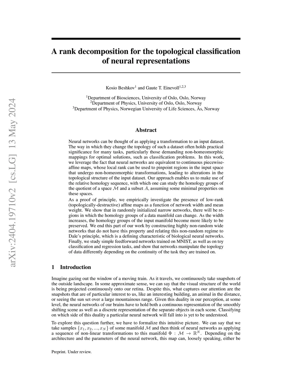 Neural networks can be thought of as applying a transformation to an input dataset. The way in which they change the topology of such a dataset often holds practical significance for many tasks, particularly those demanding non-homeomorphic mappings for optimal solutions, such as classification problems. In this work, we leverage the fact that neural networks are equivalent to continuous piecewise-affine maps, whose rank can be used to pinpoint regions in the input space that undergo non-homeomorphic transformations, leading to alterations in the topological structure of the input dataset. Our approach enables us to make use of the relative homology sequence, with which one can study the homology groups of the quotient of a manifold and a subset , assuming some minimal properties on these spaces. As a proof of principle, we empirically investigate the presence of low-rank (topology-changing) affine maps as a function of network width and mean weight. We show that in randomly initialized narrow networks, there will be regions in which the (co)homology groups of a data manifold can change. As the width increases, the homology groups of the input manifold become more likely to be preserved. We end this part of our work by constructing highly non-random wide networks that do not have this property and relating this non-random regime to Dale's principle, which is a defining characteristic of biological neural networks. Finally, we study simple feedforward networks trained on MNIST, as well as on toy classification and regression tasks, and show that networks manipulate the topology of data differently depending on the continuity of the task they are trained on.