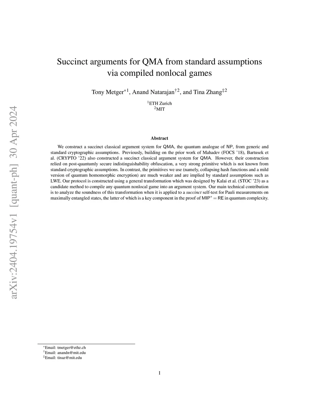 We construct a succinct classical argument system for QMA, the quantum analogue of NP, from generic and standard cryptographic assumptions. Previously, building on the prior work of Mahadev (FOCS '18), Bartusek et al. (CRYPTO '22) also constructed a succinct classical argument system for QMA. However, their construction relied on post-quantumly secure indistinguishability obfuscation, a very strong primitive which is not known from standard cryptographic assumptions. In contrast, the primitives we use (namely, collapsing hash functions and a mild version of quantum homomorphic encryption) are much weaker and are implied by standard assumptions such as LWE. Our protocol is constructed using a general transformation which was designed by Kalai et al. (STOC '23) as a candidate method to compile any quantum nonlocal game into an argument system. Our main technical contribution is to analyze the soundness of this transformation when it is applied to a succinct self-test for Pauli measurements on maximally entangled states, the latter of which is a key component in the proof of MIP*=RE in quantum complexity.