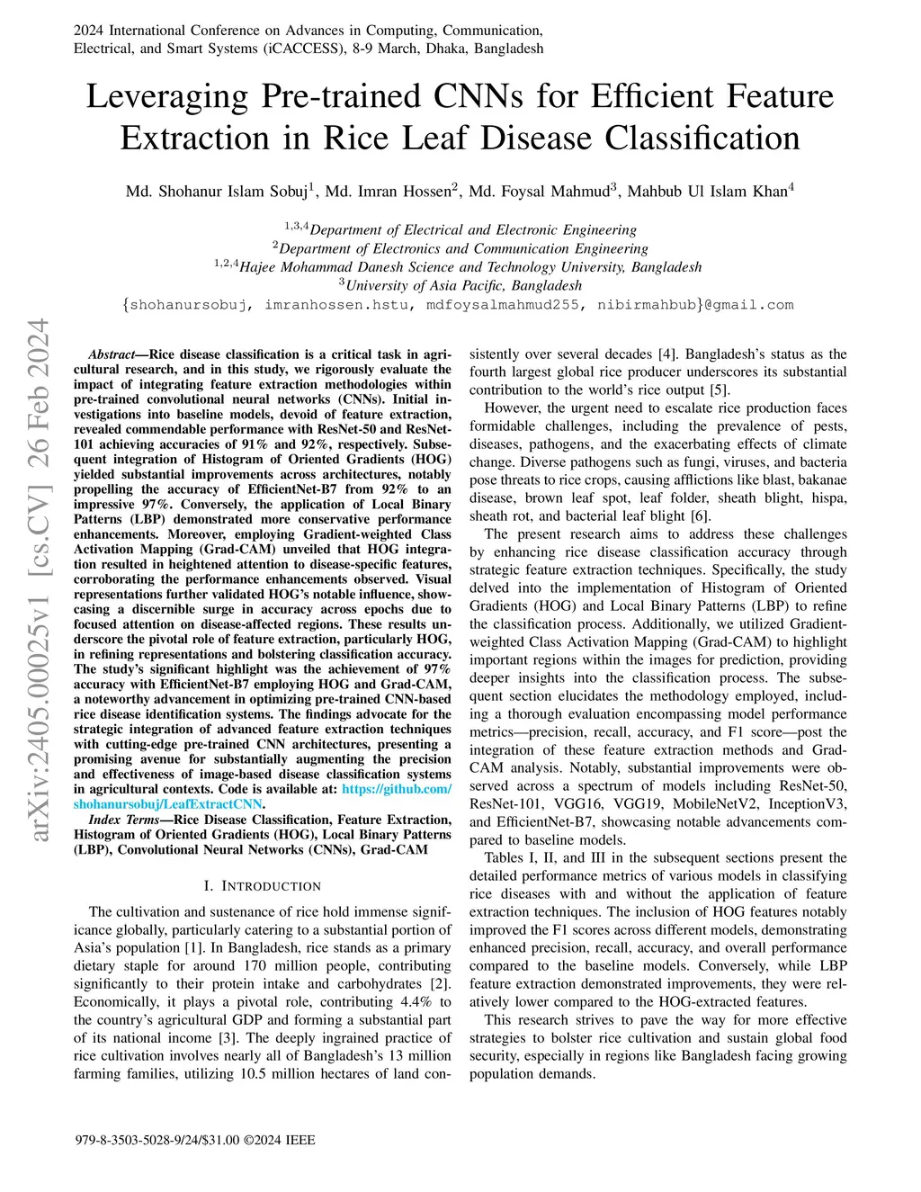 Rice disease classification is a critical task in agricultural research, and in this study, we rigorously evaluate the impact of integrating feature extraction methodologies within pre-trained convolutional neural networks (CNNs). Initial investigations into baseline models, devoid of feature extraction, revealed commendable performance with ResNet-50 and ResNet-101 achieving accuracies of 91% and 92%, respectively. Subsequent integration of Histogram of Oriented Gradients (HOG) yielded substantial improvements across architectures, notably propelling the accuracy of EfficientNet-B7 from 92\% to an impressive 97%. Conversely, the application of Local Binary Patterns (LBP) demonstrated more conservative performance enhancements. Moreover, employing Gradient-weighted Class Activation Mapping (Grad-CAM) unveiled that HOG integration resulted in heightened attention to disease-specific features, corroborating the performance enhancements observed. Visual representations further validated HOG's notable influence, showcasing a discernible surge in accuracy across epochs due to focused attention on disease-affected regions. These results underscore the pivotal role of feature extraction, particularly HOG, in refining representations and bolstering classification accuracy. The study's significant highlight was the achievement of 97% accuracy with EfficientNet-B7 employing HOG and Grad-CAM, a noteworthy advancement in optimizing pre-trained CNN-based rice disease identification systems. The findings advocate for the strategic integration of advanced feature extraction techniques with cutting-edge pre-trained CNN architectures, presenting a promising avenue for substantially augmenting the precision and effectiveness of image-based disease classification systems in agricultural contexts.