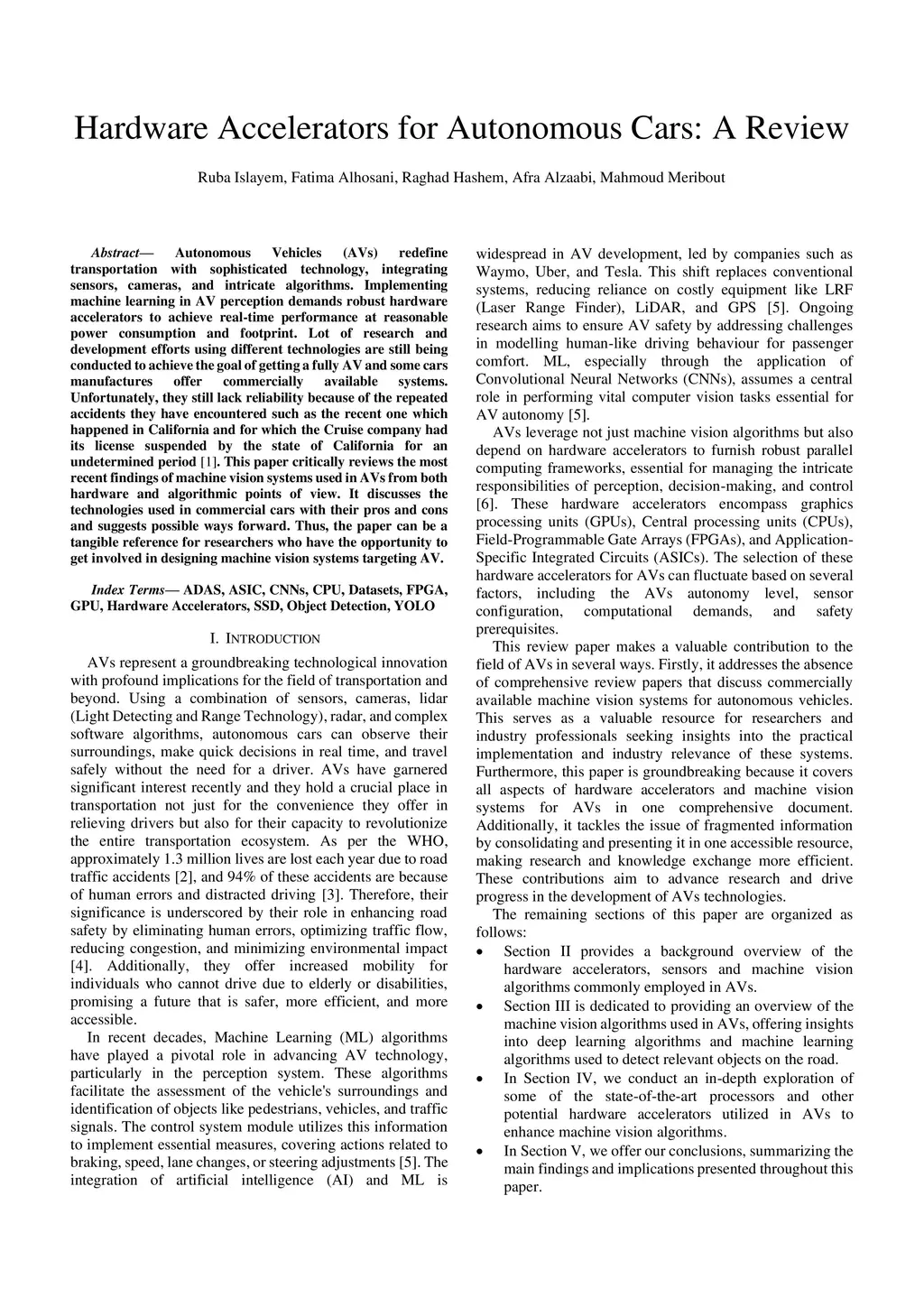 Hardware Accelerators for Autonomous Cars: A Review