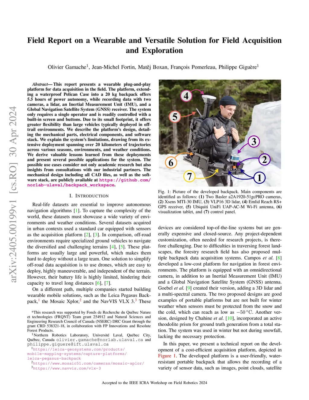 This report presents a wearable plug-and-play platform for data acquisition in the field. The platform, extending a waterproof Pelican Case into a 20 kg backpack offers 5.5 hours of power autonomy, while recording data with two cameras, a lidar, an Inertial Measurement Unit (IMU), and a Global Navigation Satellite System (GNSS) receiver. The system only requires a single operator and is readily controlled with a built-in screen and buttons. Due to its small footprint, it offers greater flexibility than large vehicles typically deployed in off-trail environments. We describe the platform's design, detailing the mechanical parts, electrical components, and software stack. We explain the system's limitations, drawing from its extensive deployment spanning over 20 kilometers of trajectories across various seasons, environments, and weather conditions. We derive valuable lessons learned from these deployments and present several possible applications for the system. The possible use cases consider not only academic research but also insights from consultations with our industrial partners. The mechanical design including all CAD files, as well as the software stack, are publicly available at https://github.com/norlab-ulaval/backpack_workspace.