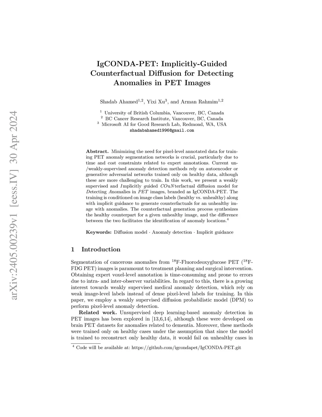 IgCONDA-PET: Implicitly-Guided Counterfactual Diffusion for Detecting