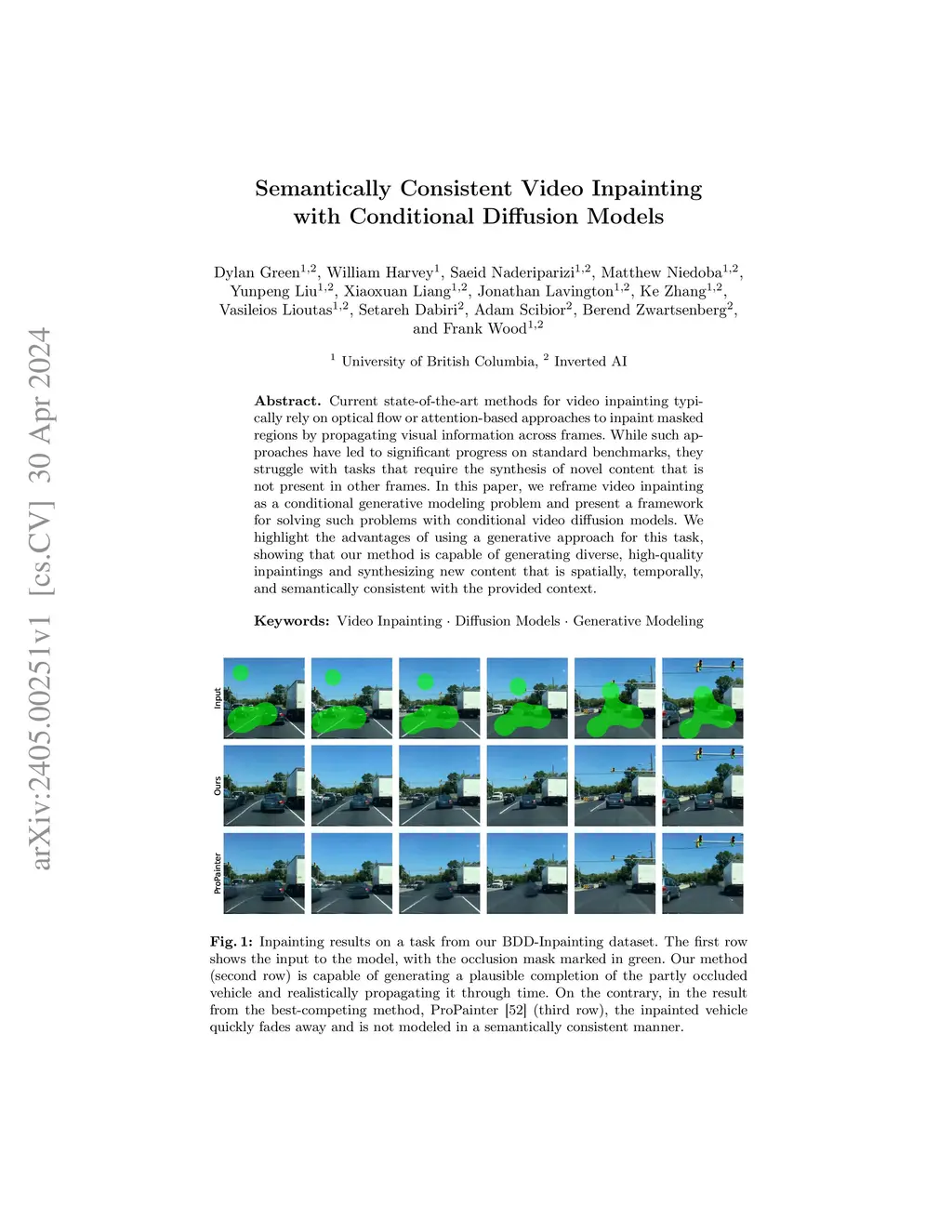 Current state-of-the-art methods for video inpainting typically rely on optical flow or attention-based approaches to inpaint masked regions by propagating visual information across frames. While such approaches have led to significant progress on standard benchmarks, they struggle with tasks that require the synthesis of novel content that is not present in other frames. In this paper we reframe video inpainting as a conditional generative modeling problem and present a framework for solving such problems with conditional video diffusion models. We highlight the advantages of using a generative approach for this task, showing that our method is capable of generating diverse, high-quality inpaintings and synthesizing new content that is spatially, temporally, and semantically consistent with the provided context.