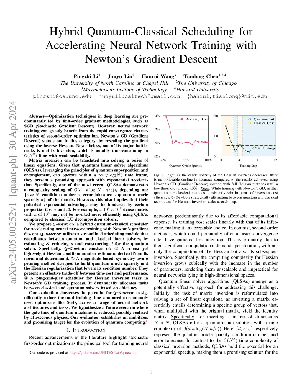 Optimization techniques in deep learning are predominantly led by first-order gradient methodologies, such as SGD. However, neural network training can greatly benefit from the rapid convergence characteristics of second-order optimization. Newton's GD stands out in this category, by rescaling the gradient using the inverse Hessian. Nevertheless, one of its major bottlenecks is matrix inversion, which is notably time-consuming in time with weak scalability.Matrix inversion can be translated into solving a series of linear equations. Given that quantum linear solver algorithms (QLSAs), leveraging the principles of quantum superposition and entanglement, can operate within a time frame, they present a promising approach with exponential acceleration. Specifically, one of the most recent QLSAs demonstrates a complexity scaling of , depending on: {size~, condition number~, error tolerance~, quantum oracle sparsity~} of the matrix. However, this also implies that their potential exponential advantage may be hindered by certain properties (i.e. and ).We propose Q-Newton, a hybrid quantum-classical scheduler for accelerating neural network training with Newton's GD. Q-Newton utilizes a streamlined scheduling module that coordinates between quantum and classical linear solvers, by estimating & reducing and constructing for the quantum solver.Our evaluation showcases the potential for Q-Newton to significantly reduce the total training time compared to commonly used optimizers like SGD. We hypothesize a future scenario where the gate time of quantum machines is reduced, possibly realized by attoseconds physics. Our evaluation establishes an ambitious and promising target for the evolution of quantum computing.