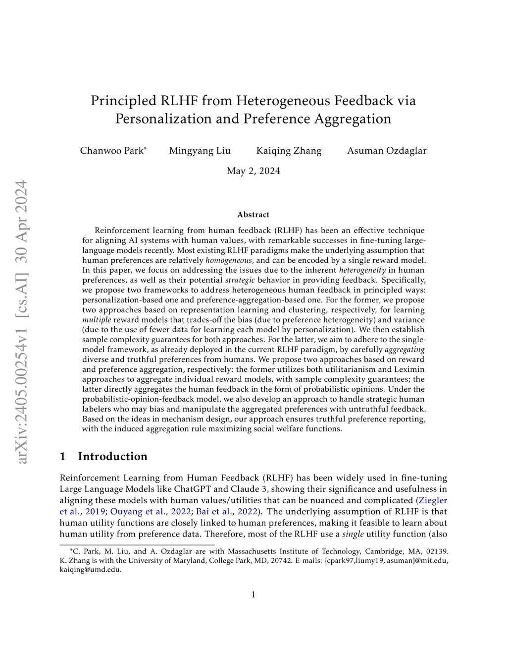 Reinforcement learning from human feedback (RLHF) has been an effective technique for aligning AI systems with human values, with remarkable successes in fine-tuning large-language models recently. Most existing RLHF paradigms make the underlying assumption that human preferences are relatively homogeneous, and can be encoded by a single reward model. In this paper, we focus on addressing the issues due to the inherent heterogeneity in human preferences, as well as their potential strategic behavior in providing feedback. Specifically, we propose two frameworks to address heterogeneous human feedback in principled ways: personalization-based one and aggregation-based one. For the former, we propose two approaches based on representation learning and clustering, respectively, for learning multiple reward models that trades off the bias (due to preference heterogeneity) and variance (due to the use of fewer data for learning each model by personalization). We then establish sample complexity guarantees for both approaches. For the latter, we aim to adhere to the single-model framework, as already deployed in the current RLHF paradigm, by carefully aggregating diverse and truthful preferences from humans. We propose two approaches based on reward and preference aggregation, respectively: the former utilizes both utilitarianism and Leximin approaches to aggregate individual reward models, with sample complexity guarantees; the latter directly aggregates the human feedback in the form of probabilistic opinions. Under the probabilistic-opinion-feedback model, we also develop an approach to handle strategic human labelers who may bias and manipulate the aggregated preferences with untruthful feedback. Based on the ideas in mechanism design, our approach ensures truthful preference reporting, with the induced aggregation rule maximizing social welfare functions.