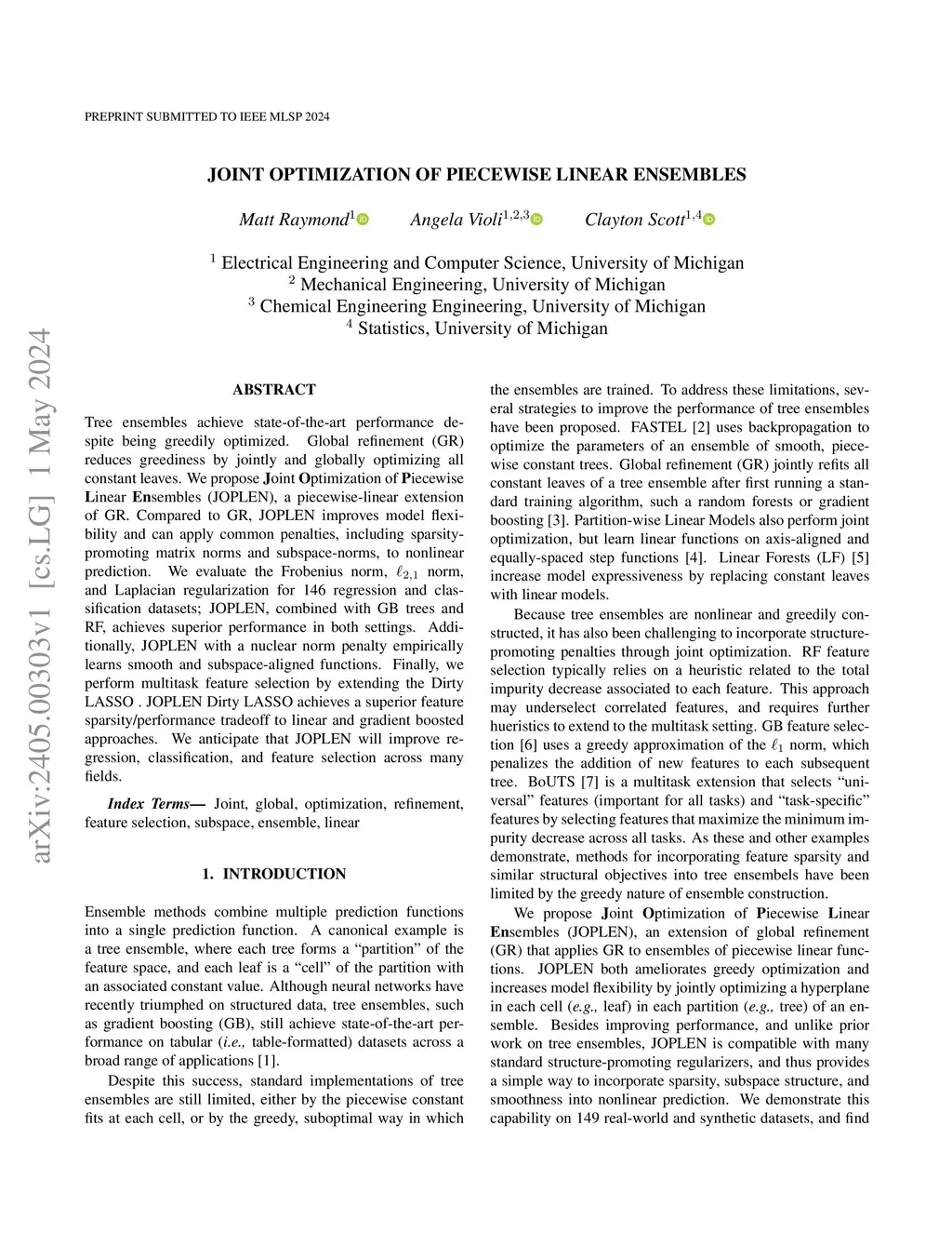 Tree ensembles achieve state-of-the-art performance on numerous prediction tasks. We propose Joint Optimization of Piecewise Linear ENsembles (JOPLEN), which jointly fits piecewise linear models at all leaf nodes of an existing tree ensemble. In addition to enhancing the expressiveness of an ensemble, JOPLEN allows several common penalties, including sparsity-promoting matrix norms and subspace-norms, to be applied to nonlinear prediction. We demonstrate the performance of JOPLEN on over 100 regression and classification datasets and with a variety of penalties. JOPLEN leads to improved prediction performance relative to not only standard random forest and gradient boosted tree ensembles, but also other methods for enhancing tree ensembles. We demonstrate that JOPLEN with a nuclear norm penalty learns subspace-aligned functions. Additionally, JOPLEN combined with a Dirty LASSO penalty is an effective feature selection method for nonlinear prediction in multitask learning.