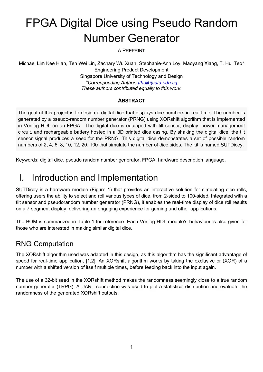 The goal of this project is to design a digital dice that displays dice numbers in real-time. The number is generated by a pseudo-random number generator (PRNG) using XORshift algorithm that is implemented in Verilog HDL on an FPGA. The digital dice is equipped with tilt sensor, display, power management circuit, and rechargeable battery hosted in a 3D printed dice casing. By shaking the digital dice, the tilt sensor signal produces a seed for the PRNG. This digital dice demonstrates a set of possible random numbers of 2, 4, 6, 8, 10, 12, 20, 100 that simulate the number of dice sides. The kit is named SUTDicey.