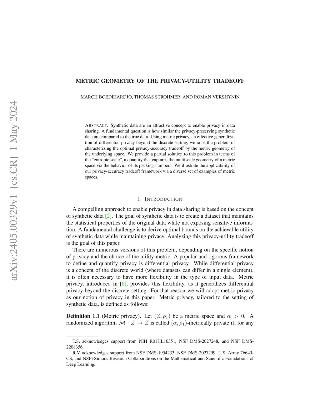 Synthetic data are an attractive concept to enable privacy in data sharing. A fundamental question is how similar the privacy-preserving synthetic data are compared to the true data. Using metric privacy, an effective generalization of differential privacy beyond the discrete setting, we raise the problem of characterizing the optimal privacy-accuracy tradeoff by the metric geometry of the underlying space. We provide a partial solution to this problem in terms of the "entropic scale", a quantity that captures the multiscale geometry of a metric space via the behavior of its packing numbers. We illustrate the applicability of our privacy-accuracy tradeoff framework via a diverse set of examples of metric spaces.