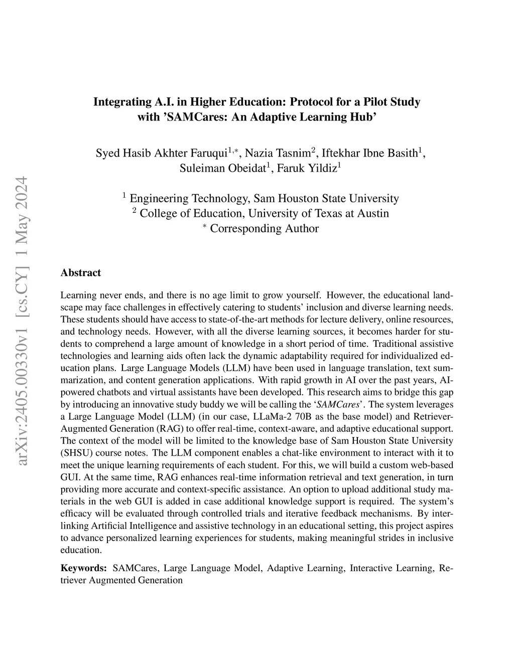 Learning never ends, and there is no age limit to grow yourself. However, the educational landscape may face challenges in effectively catering to students' inclusion and diverse learning needs. These students should have access to state-of-the-art methods for lecture delivery, online resources, and technology needs. However, with all the diverse learning sources, it becomes harder for students to comprehend a large amount of knowledge in a short period of time. Traditional assistive technologies and learning aids often lack the dynamic adaptability required for individualized education plans. Large Language Models (LLM) have been used in language translation, text summarization, and content generation applications. With rapid growth in AI over the past years, AI-powered chatbots and virtual assistants have been developed. This research aims to bridge this gap by introducing an innovative study buddy we will be calling the 'SAMCares'. The system leverages a Large Language Model (LLM) (in our case, LLaMa-2 70B as the base model) and Retriever-Augmented Generation (RAG) to offer real-time, context-aware, and adaptive educational support. The context of the model will be limited to the knowledge base of Sam Houston State University (SHSU) course notes. The LLM component enables a chat-like environment to interact with it to meet the unique learning requirements of each student. For this, we will build a custom web-based GUI. At the same time, RAG enhances real-time information retrieval and text generation, in turn providing more accurate and context-specific assistance. An option to upload additional study materials in the web GUI is added in case additional knowledge support is required. The system's efficacy will be evaluated through controlled trials and iterative feedback mechanisms.