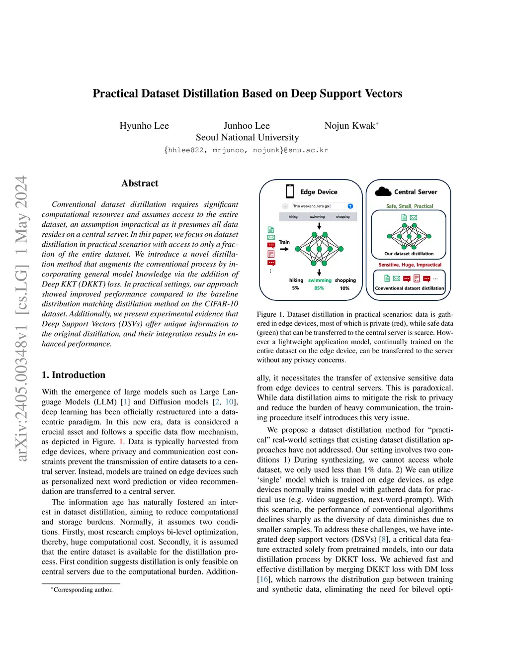 Conventional dataset distillation requires significant computational resources and assumes access to the entire dataset, an assumption impractical as it presumes all data resides on a central server. In this paper, we focus on dataset distillation in practical scenarios with access to only a fraction of the entire dataset. We introduce a novel distillation method that augments the conventional process by incorporating general model knowledge via the addition of Deep KKT (DKKT) loss. In practical settings, our approach showed improved performance compared to the baseline distribution matching distillation method on the CIFAR-10 dataset. Additionally, we present experimental evidence that Deep Support Vectors (DSVs) offer unique information to the original distillation, and their integration results in enhanced performance.