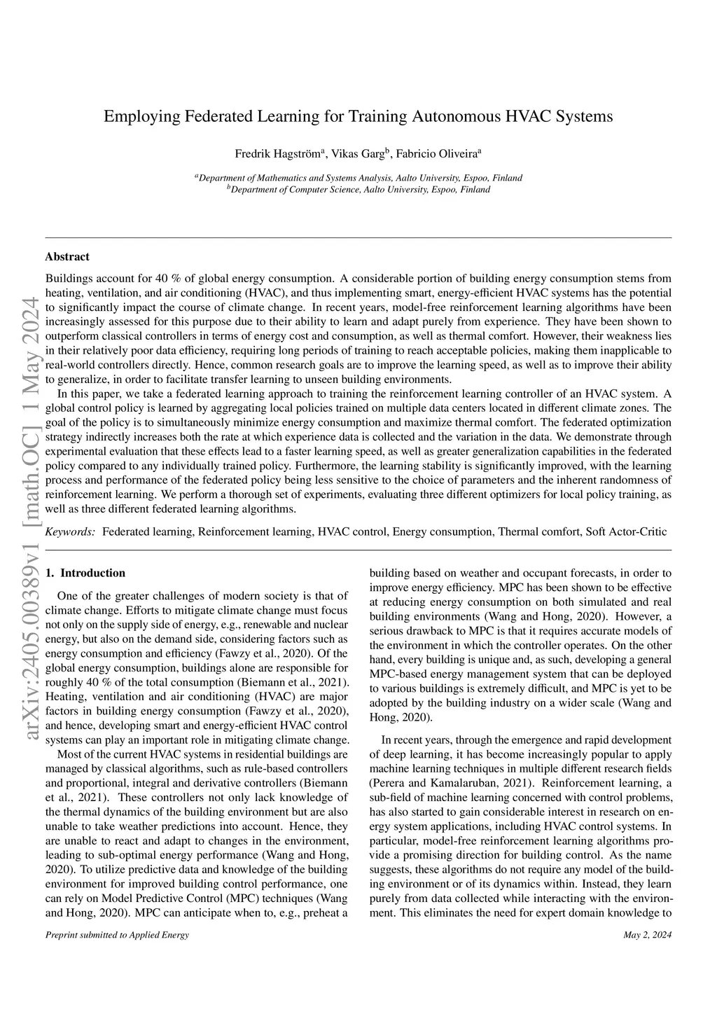 Employing Federated Learning for Training Autonomous HVAC Systems