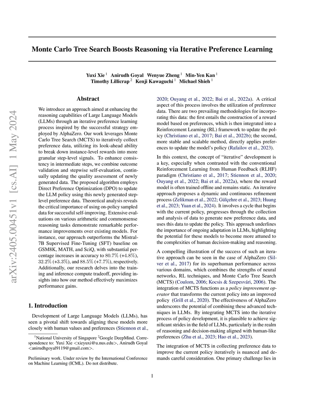 We introduce an approach aimed at enhancing the reasoning capabilities of Large Language Models (LLMs) through an iterative preference learning process inspired by the successful strategy employed by AlphaZero. Our work leverages Monte Carlo Tree Search (MCTS) to iteratively collect preference data, utilizing its look-ahead ability to break down instance-level rewards into more granular step-level signals. To enhance consistency in intermediate steps, we combine outcome validation and stepwise self-evaluation, continually updating the quality assessment of newly generated data. The proposed algorithm employs Direct Preference Optimization (DPO) to update the LLM policy using this newly generated step-level preference data. Theoretical analysis reveals the importance of using on-policy sampled data for successful self-improving. Extensive evaluations on various arithmetic and commonsense reasoning tasks demonstrate remarkable performance improvements over existing models. For instance, our approach outperforms the Mistral-7B Supervised Fine-Tuning (SFT) baseline on GSM8K, MATH, and ARC-C, with substantial increases in accuracy to (+), (+), and (+), respectively. Additionally, our research delves into the training and inference compute tradeoff, providing insights into how our method effectively maximizes performance gains. Our code is publicly available at https://github.com/YuxiXie/MCTS-DPO.