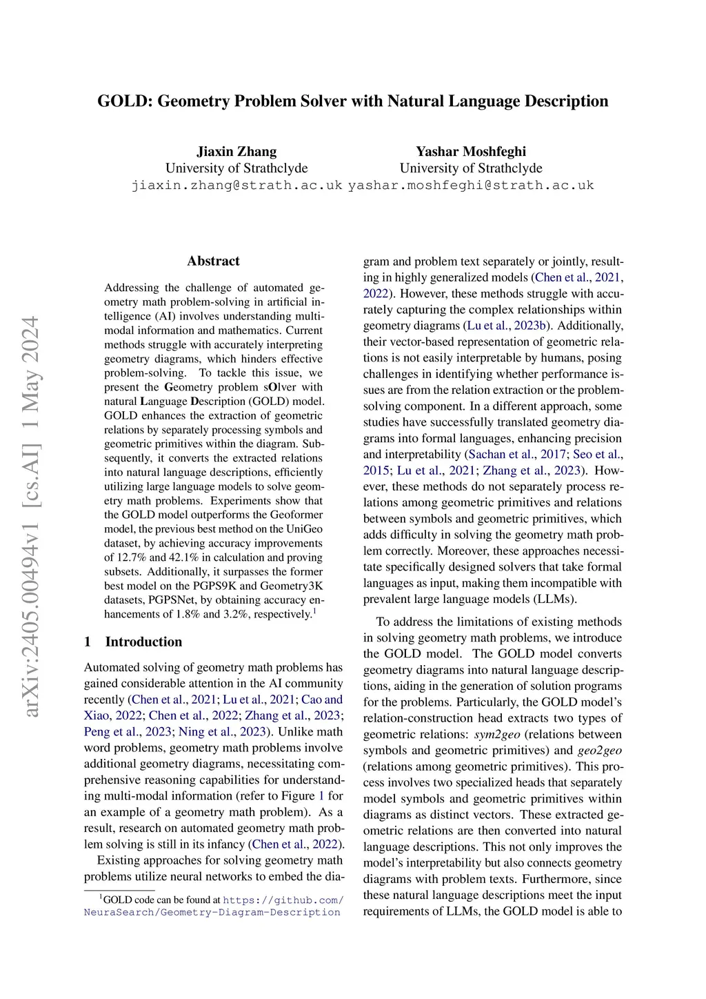 Addressing the challenge of automated geometry math problem-solving in artificial intelligence (AI) involves understanding multi-modal information and mathematics. Current methods struggle with accurately interpreting geometry diagrams, which hinders effective problem-solving. To tackle this issue, we present the Geometry problem sOlver with natural Language Description (GOLD) model. GOLD enhances the extraction of geometric relations by separately processing symbols and geometric primitives within the diagram. Subsequently, it converts the extracted relations into natural language descriptions, efficiently utilizing large language models to solve geometry math problems. Experiments show that the GOLD model outperforms the Geoformer model, the previous best method on the UniGeo dataset, by achieving accuracy improvements of 12.7% and 42.1% in calculation and proving subsets. Additionally, it surpasses the former best model on the PGPS9K and Geometry3K datasets, PGPSNet, by obtaining accuracy enhancements of 1.8% and 3.2%, respectively.