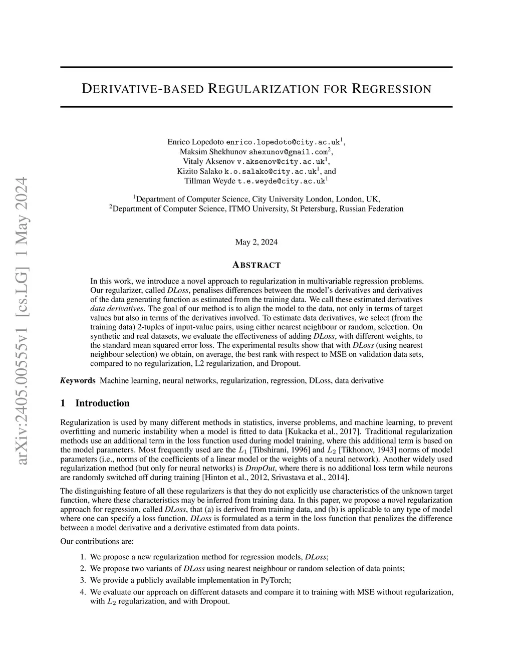 In this work, we introduce a novel approach to regularization in multivariable regression problems. Our regularizer, called DLoss, penalises differences between the model's derivatives and derivatives of the data generating function as estimated from the training data. We call these estimated derivatives data derivatives. The goal of our method is to align the model to the data, not only in terms of target values but also in terms of the derivatives involved. To estimate data derivatives, we select (from the training data) 2-tuples of input-value pairs, using either nearest neighbour or random, selection. On synthetic and real datasets, we evaluate the effectiveness of adding DLoss, with different weights, to the standard mean squared error loss. The experimental results show that with DLoss (using nearest neighbour selection) we obtain, on average, the best rank with respect to MSE on validation data sets, compared to no regularization, L2 regularization, and Dropout.