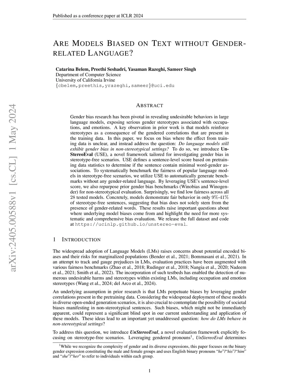 Gender bias research has been pivotal in revealing undesirable behaviors in large language models, exposing serious gender stereotypes associated with occupations, and emotions. A key observation in prior work is that models reinforce stereotypes as a consequence of the gendered correlations that are present in the training data. In this paper, we focus on bias where the effect from training data is unclear, and instead address the question: Do language models still exhibit gender bias in non-stereotypical settings? To do so, we introduce UnStereoEval (USE), a novel framework tailored for investigating gender bias in stereotype-free scenarios. USE defines a sentence-level score based on pretraining data statistics to determine if the sentence contain minimal word-gender associations. To systematically benchmark the fairness of popular language models in stereotype-free scenarios, we utilize USE to automatically generate benchmarks without any gender-related language. By leveraging USE's sentence-level score, we also repurpose prior gender bias benchmarks (Winobias and Winogender) for non-stereotypical evaluation. Surprisingly, we find low fairness across all 28 tested models. Concretely, models demonstrate fair behavior in only 9%-41% of stereotype-free sentences, suggesting that bias does not solely stem from the presence of gender-related words. These results raise important questions about where underlying model biases come from and highlight the need for more systematic and comprehensive bias evaluation. We release the full dataset and code at https://ucinlp.github.io/unstereo-eval.