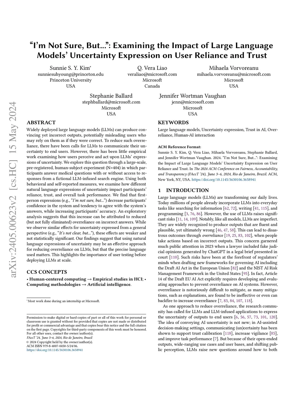 Widely deployed large language models (LLMs) can produce convincing yet incorrect outputs, potentially misleading users who may rely on them as if they were correct. To reduce such overreliance, there have been calls for LLMs to communicate their uncertainty to end users. However, there has been little empirical work examining how users perceive and act upon LLMs' expressions of uncertainty. We explore this question through a large-scale, pre-registered, human-subject experiment (N=404) in which participants answer medical questions with or without access to responses from a fictional LLM-infused search engine. Using both behavioral and self-reported measures, we examine how different natural language expressions of uncertainty impact participants' reliance, trust, and overall task performance. We find that first-person expressions (e.g., "I'm not sure, but...") decrease participants' confidence in the system and tendency to agree with the system's answers, while increasing participants' accuracy. An exploratory analysis suggests that this increase can be attributed to reduced (but not fully eliminated) overreliance on incorrect answers. While we observe similar effects for uncertainty expressed from a general perspective (e.g., "It's not clear, but..."), these effects are weaker and not statistically significant. Our findings suggest that using natural language expressions of uncertainty may be an effective approach for reducing overreliance on LLMs, but that the precise language used matters. This highlights the importance of user testing before deploying LLMs at scale.