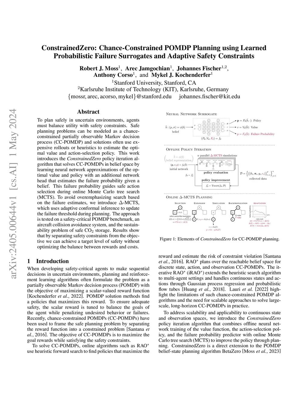 To plan safely in uncertain environments, agents must balance utility with safety constraints. Safe planning problems can be modeled as a chance-constrained partially observable Markov decision process (CC-POMDP) and solutions often use expensive rollouts or heuristics to estimate the optimal value and action-selection policy. This work introduces the ConstrainedZero policy iteration algorithm that solves CC-POMDPs in belief space by learning neural network approximations of the optimal value and policy with an additional network head that estimates the failure probability given a belief. This failure probability guides safe action selection during online Monte Carlo tree search (MCTS). To avoid overemphasizing search based on the failure estimates, we introduce -MCTS, which uses adaptive conformal inference to update the failure threshold during planning. The approach is tested on a safety-critical POMDP benchmark, an aircraft collision avoidance system, and the sustainability problem of safe CO storage. Results show that by separating safety constraints from the objective we can achieve a target level of safety without optimizing the balance between rewards and costs.