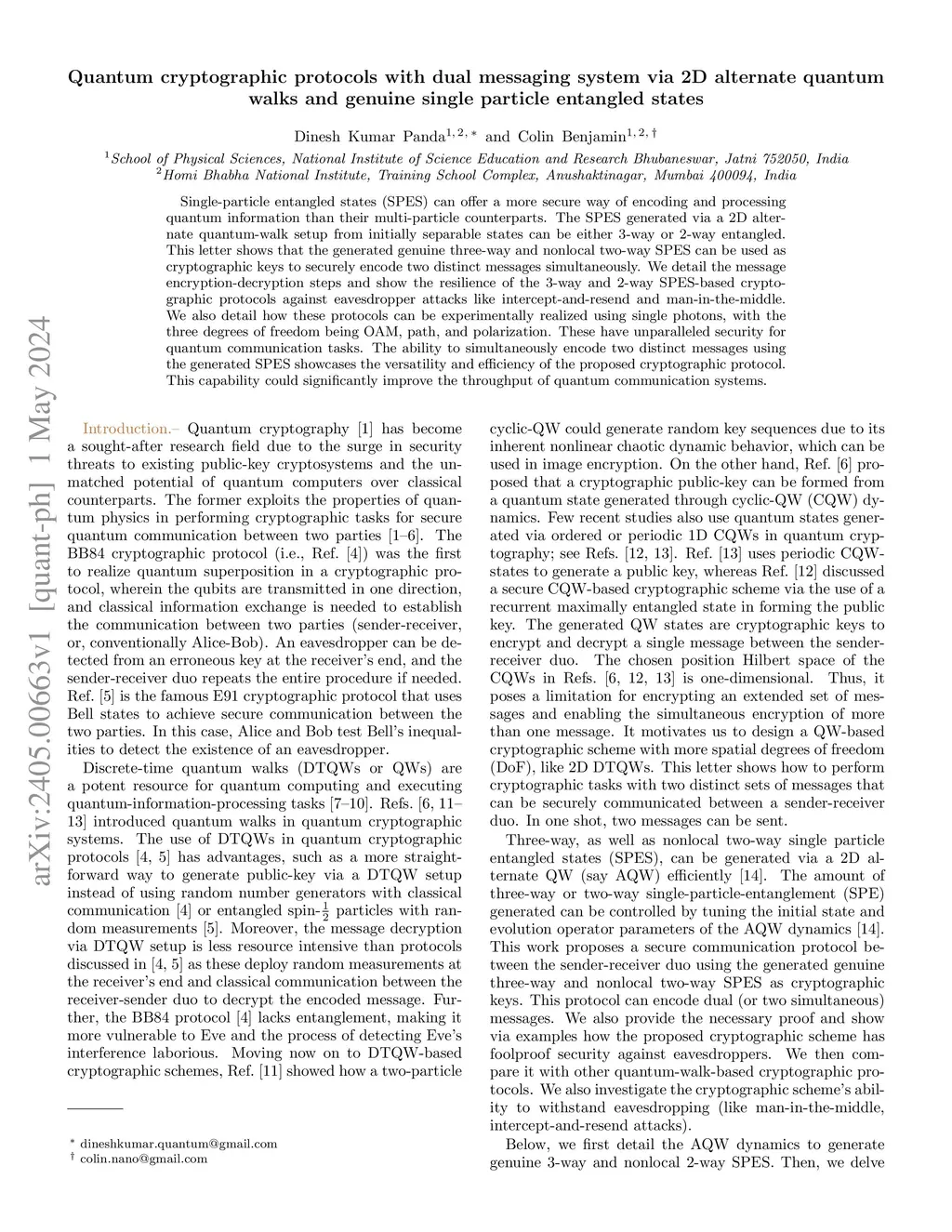 Single-particle entangled states (SPES) can offer a more secure way of encoding and processing quantum information than their multi-particle counterparts. The SPES generated via a 2D alternate quantum-walk setup from initially separable states can be either 3-way or 2-way entangled. This letter shows that the generated genuine three-way and nonlocal two-way SPES can be used as cryptographic keys to securely encode two distinct messages simultaneously. We detail the message encryption-decryption steps and show the resilience of the 3-way and 2-way SPES-based cryptographic protocols against eavesdropper attacks like intercept-and-resend and man-in-the-middle. We also detail how these protocols can be experimentally realized using single photons, with the three degrees of freedom being OAM, path, and polarization. These have unparalleled security for quantum communication tasks. The ability to simultaneously encode two distinct messages using the generated SPES showcases the versatility and efficiency of the proposed cryptographic protocol. This capability could significantly improve the throughput of quantum communication systems.