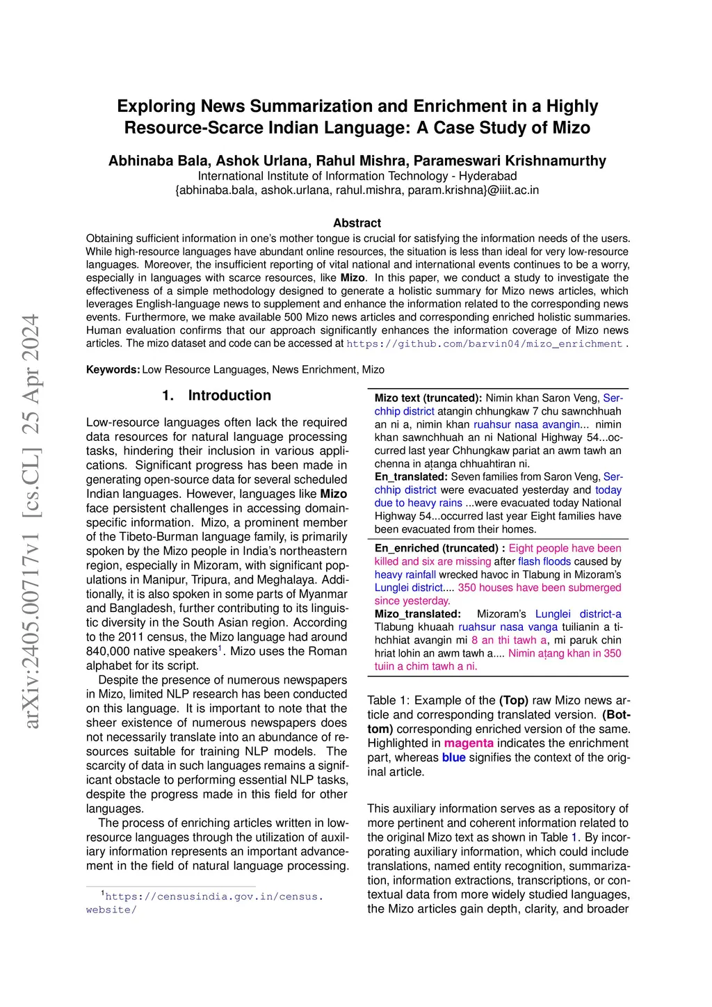 Obtaining sufficient information in one's mother tongue is crucial for satisfying the information needs of the users. While high-resource languages have abundant online resources, the situation is less than ideal for very low-resource languages. Moreover, the insufficient reporting of vital national and international events continues to be a worry, especially in languages with scarce resources, like \textbf{Mizo}. In this paper, we conduct a study to investigate the effectiveness of a simple methodology designed to generate a holistic summary for Mizo news articles, which leverages English-language news to supplement and enhance the information related to the corresponding news events. Furthermore, we make available 500 Mizo news articles and corresponding enriched holistic summaries. Human evaluation confirms that our approach significantly enhances the information coverage of Mizo news articles. The mizo dataset and code can be accessed at \url{https://github.com/barvin04/mizo_enrichment