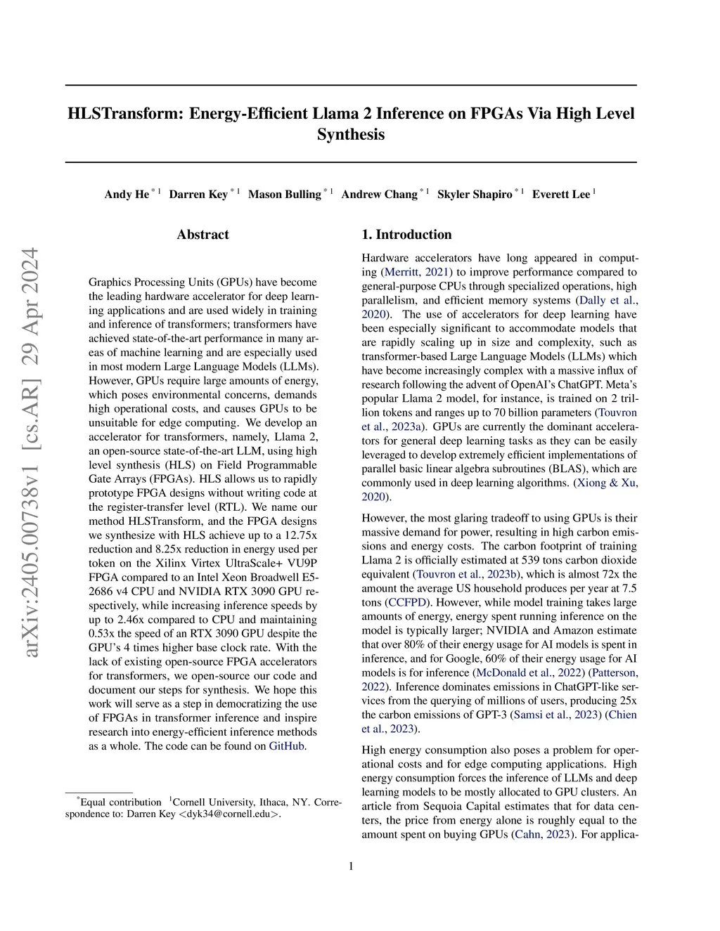 Graphics Processing Units (GPUs) have become the leading hardware accelerator for deep learning applications and are used widely in training and inference of transformers; transformers have achieved state-of-the-art performance in many areas of machine learning and are especially used in most modern Large Language Models (LLMs). However, GPUs require large amounts of energy, which poses environmental concerns, demands high operational costs, and causes GPUs to be unsuitable for edge computing. We develop an accelerator for transformers, namely, Llama 2, an open-source state-of-the-art LLM, using high level synthesis (HLS) on Field Programmable Gate Arrays (FPGAs). HLS allows us to rapidly prototype FPGA designs without writing code at the register-transfer level (RTL). We name our method HLSTransform, and the FPGA designs we synthesize with HLS achieve up to a 12.75x reduction and 8.25x reduction in energy used per token on the Xilinx Virtex UltraScale+ VU9P FPGA compared to an Intel Xeon Broadwell E5-2686 v4 CPU and NVIDIA RTX 3090 GPU respectively, while increasing inference speeds by up to 2.46x compared to CPU and maintaining 0.53x the speed of an RTX 3090 GPU despite the GPU's 4 times higher base clock rate. With the lack of existing open-source FPGA accelerators for transformers, we open-source our code and document our steps for synthesis. We hope this work will serve as a step in democratizing the use of FPGAs in transformer inference and inspire research into energy-efficient inference methods as a whole. The code can be found on https://github.com/HLSTransform/submission.