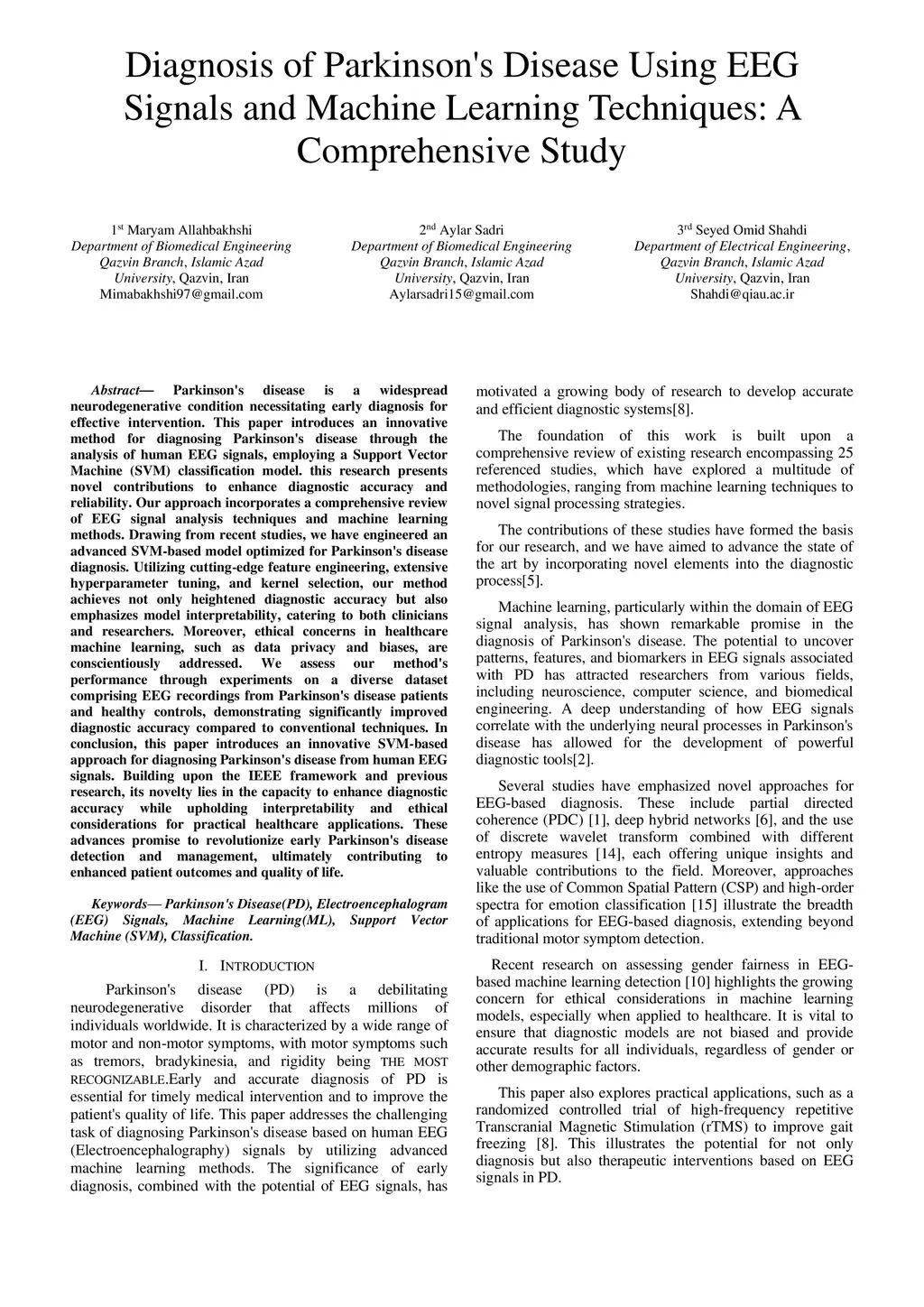 Parkinson's disease is a widespread neurodegenerative condition necessitating early diagnosis for effective intervention. This paper introduces an innovative method for diagnosing Parkinson's disease through the analysis of human EEG signals, employing a Support Vector Machine (SVM) classification model. this research presents novel contributions to enhance diagnostic accuracy and reliability. Our approach incorporates a comprehensive review of EEG signal analysis techniques and machine learning methods. Drawing from recent studies, we have engineered an advanced SVM-based model optimized for Parkinson's disease diagnosis. Utilizing cutting-edge feature engineering, extensive hyperparameter tuning, and kernel selection, our method achieves not only heightened diagnostic accuracy but also emphasizes model interpretability, catering to both clinicians and researchers. Moreover, ethical concerns in healthcare machine learning, such as data privacy and biases, are conscientiously addressed. We assess our method's performance through experiments on a diverse dataset comprising EEG recordings from Parkinson's disease patients and healthy controls, demonstrating significantly improved diagnostic accuracy compared to conventional techniques. In conclusion, this paper introduces an innovative SVM-based approach for diagnosing Parkinson's disease from human EEG signals. Building upon the IEEE framework and previous research, its novelty lies in the capacity to enhance diagnostic accuracy while upholding interpretability and ethical considerations for practical healthcare applications. These advances promise to revolutionize early Parkinson's disease detection and management, ultimately contributing to enhanced patient outcomes and quality of life.