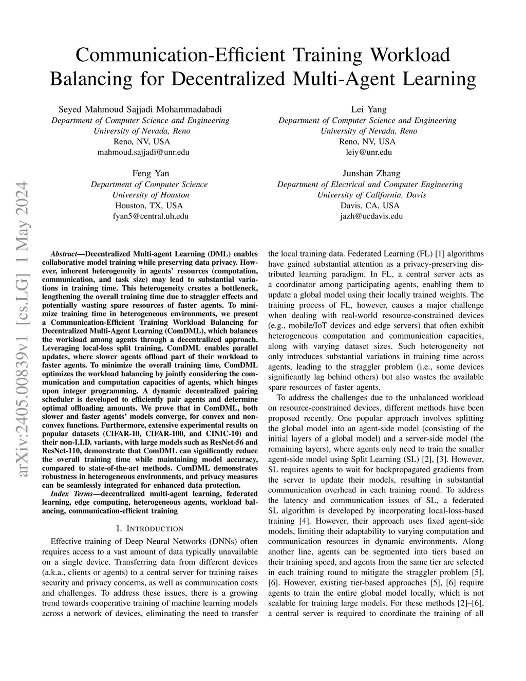 Decentralized Multi-agent Learning (DML) enables collaborative model training while preserving data privacy. However, inherent heterogeneity in agents' resources (computation, communication, and task size) may lead to substantial variations in training time. This heterogeneity creates a bottleneck, lengthening the overall training time due to straggler effects and potentially wasting spare resources of faster agents. To minimize training time in heterogeneous environments, we present a Communication-Efficient Training Workload Balancing for Decentralized Multi-Agent Learning (ComDML), which balances the workload among agents through a decentralized approach. Leveraging local-loss split training, ComDML enables parallel updates, where slower agents offload part of their workload to faster agents. To minimize the overall training time, ComDML optimizes the workload balancing by jointly considering the communication and computation capacities of agents, which hinges upon integer programming. A dynamic decentralized pairing scheduler is developed to efficiently pair agents and determine optimal offloading amounts. We prove that in ComDML, both slower and faster agents' models converge, for convex and non-convex functions. Furthermore, extensive experimental results on popular datasets (CIFAR-10, CIFAR-100, and CINIC-10) and their non-I.I.D. variants, with large models such as ResNet-56 and ResNet-110, demonstrate that ComDML can significantly reduce the overall training time while maintaining model accuracy, compared to state-of-the-art methods. ComDML demonstrates robustness in heterogeneous environments, and privacy measures can be seamlessly integrated for enhanced data protection.