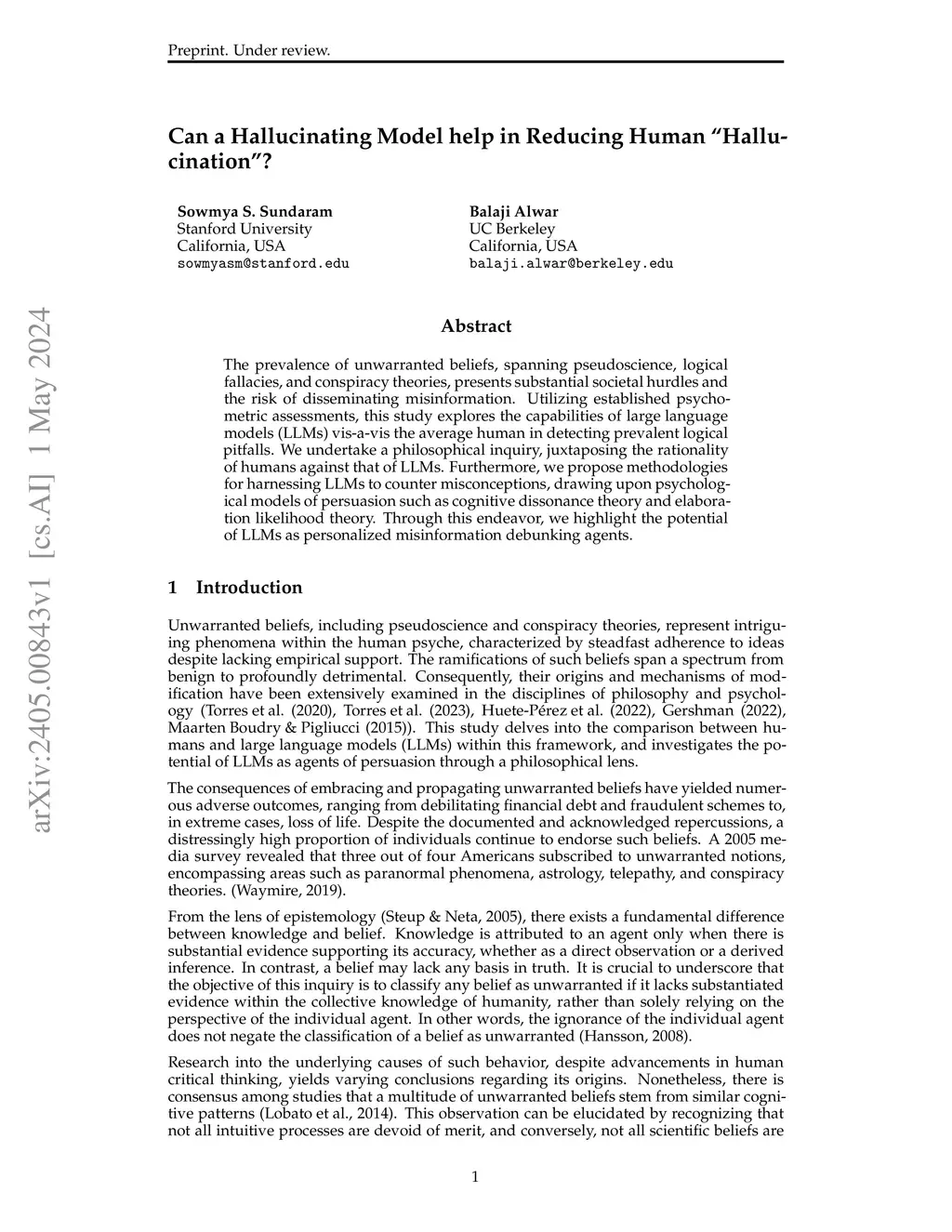 The prevalence of unwarranted beliefs, spanning pseudoscience, logical fallacies, and conspiracy theories, presents substantial societal hurdles and the risk of disseminating misinformation. Utilizing established psychometric assessments, this study explores the capabilities of large language models (LLMs) vis-a-vis the average human in detecting prevalent logical pitfalls. We undertake a philosophical inquiry, juxtaposing the rationality of humans against that of LLMs. Furthermore, we propose methodologies for harnessing LLMs to counter misconceptions, drawing upon psychological models of persuasion such as cognitive dissonance theory and elaboration likelihood theory. Through this endeavor, we highlight the potential of LLMs as personalized misinformation debunking agents.