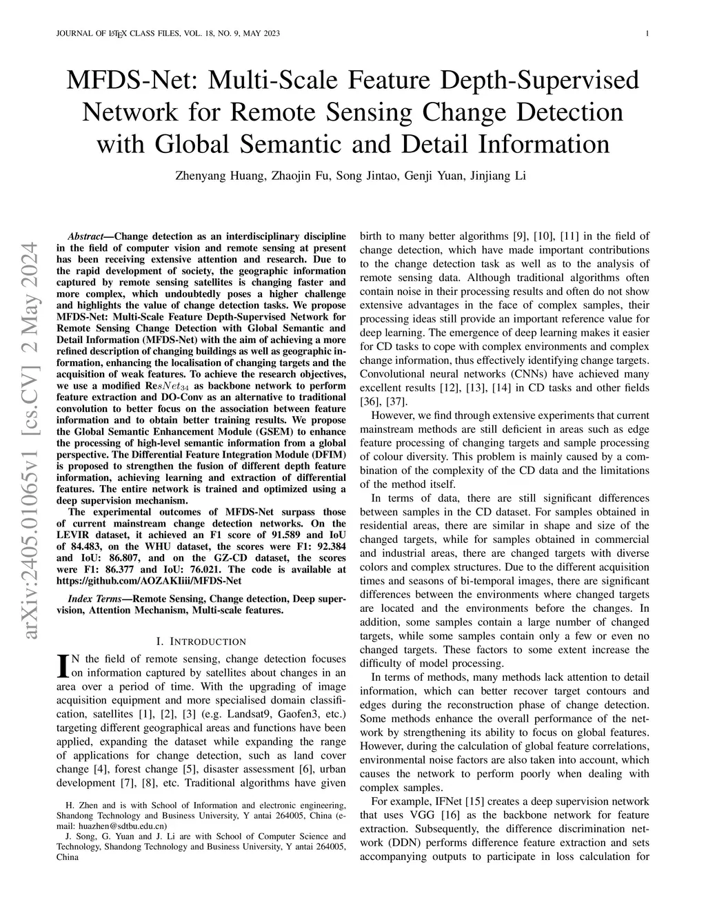 MFDS-Net: Multi-Scale Feature Depth-Supervised Network for Remote