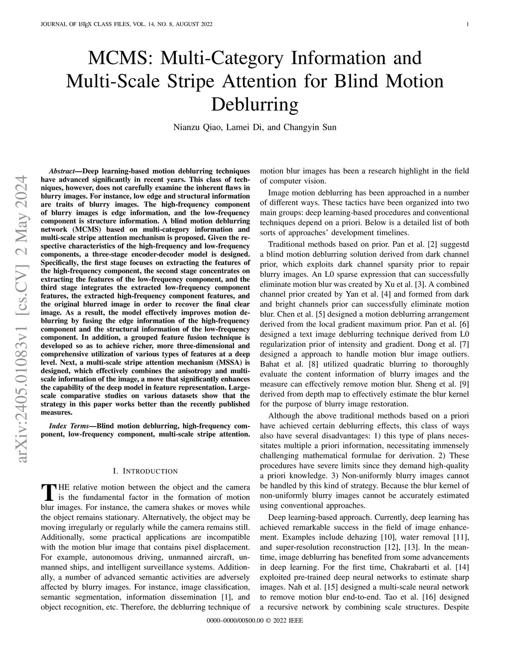 Deep learning-based motion deblurring techniques have advanced significantly in recent years. This class of techniques, however, does not carefully examine the inherent flaws in blurry images. For instance, low edge and structural information are traits of blurry images. The high-frequency component of blurry images is edge information, and the low-frequency component is structure information. A blind motion deblurring network (MCMS) based on multi-category information and multi-scale stripe attention mechanism is proposed. Given the respective characteristics of the high-frequency and low-frequency components, a three-stage encoder-decoder model is designed. Specifically, the first stage focuses on extracting the features of the high-frequency component, the second stage concentrates on extracting the features of the low-frequency component, and the third stage integrates the extracted low-frequency component features, the extracted high-frequency component features, and the original blurred image in order to recover the final clear image. As a result, the model effectively improves motion deblurring by fusing the edge information of the high-frequency component and the structural information of the low-frequency component. In addition, a grouped feature fusion technique is developed so as to achieve richer, more three-dimensional and comprehensive utilization of various types of features at a deep level. Next, a multi-scale stripe attention mechanism (MSSA) is designed, which effectively combines the anisotropy and multi-scale information of the image, a move that significantly enhances the capability of the deep model in feature representation. Large-scale comparative studies on various datasets show that the strategy in this paper works better than the recently published measures.