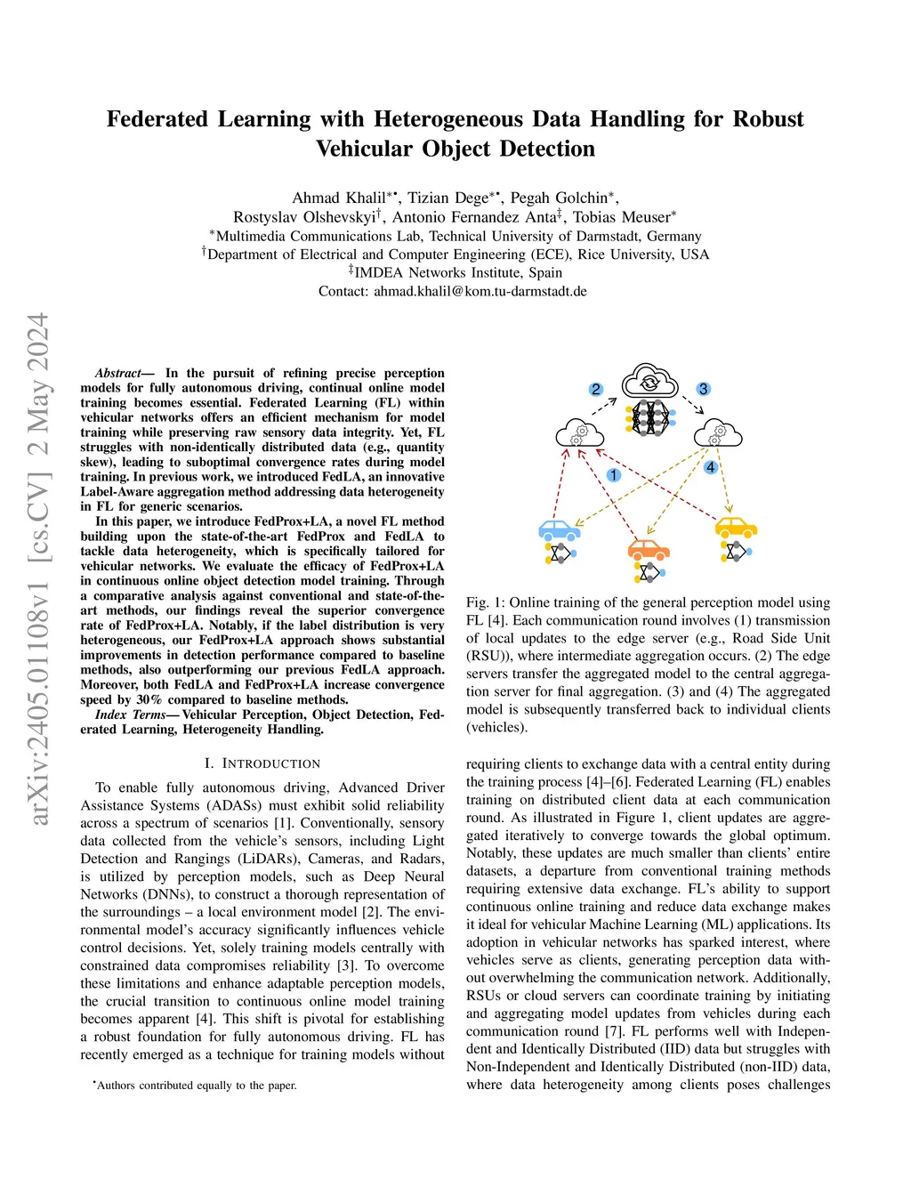 In the pursuit of refining precise perception models for fully autonomous driving, continual online model training becomes essential. Federated Learning (FL) within vehicular networks offers an efficient mechanism for model training while preserving raw sensory data integrity. Yet, FL struggles with non-identically distributed data (e.g., quantity skew), leading to suboptimal convergence rates during model training. In previous work, we introduced FedLA, an innovative Label-Aware aggregation method addressing data heterogeneity in FL for generic scenarios. In this paper, we introduce FedProx+LA, a novel FL method building upon the state-of-the-art FedProx and FedLA to tackle data heterogeneity, which is specifically tailored for vehicular networks. We evaluate the efficacy of FedProx+LA in continuous online object detection model training. Through a comparative analysis against conventional and state-of-the-art methods, our findings reveal the superior convergence rate of FedProx+LA. Notably, if the label distribution is very heterogeneous, our FedProx+LA approach shows substantial improvements in detection performance compared to baseline methods, also outperforming our previous FedLA approach. Moreover, both FedLA and FedProx+LA increase convergence speed by 30% compared to baseline methods.