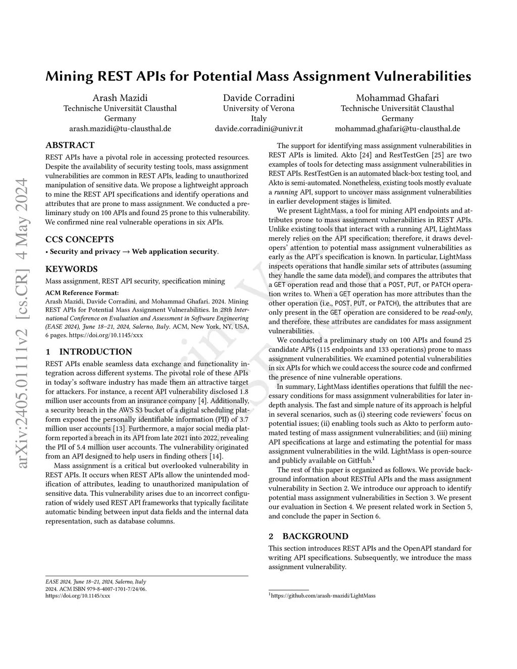 Mining REST APIs for Potential Mass Assignment Vulnerabilities