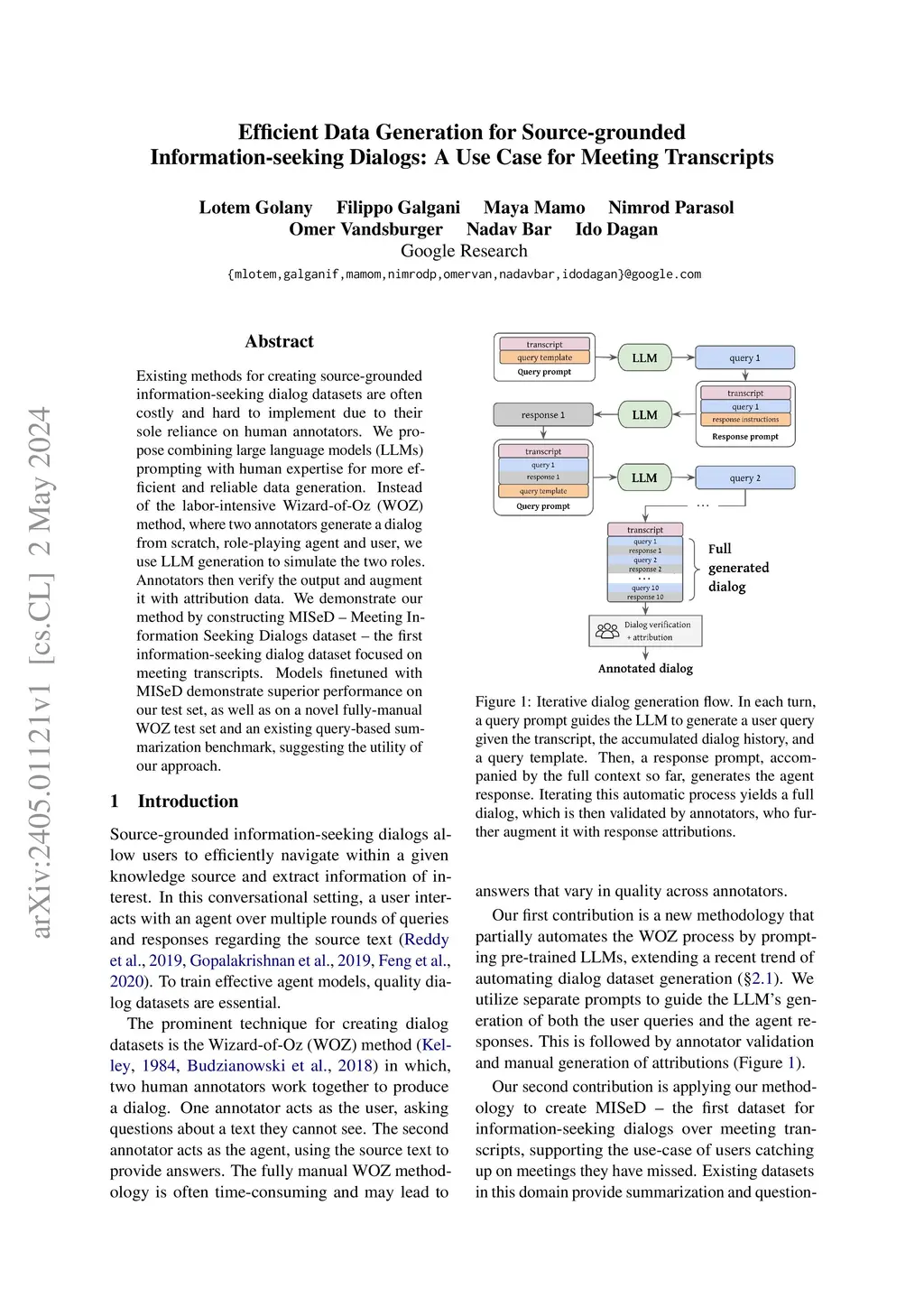 Automating data generation with Large Language Models (LLMs) has become increasingly popular. In this work, we investigate the feasibility and effectiveness of LLM-based data generation in the challenging setting of source-grounded information-seeking dialogs, with response attribution, over long documents. Our source texts consist of long and noisy meeting transcripts, adding to the task complexity. Since automating attribution remains difficult, we propose a semi-automatic approach: dialog queries and responses are generated with LLMs, followed by human verification and identification of attribution spans. Using this approach, we created MISeD -- Meeting Information Seeking Dialogs dataset -- a dataset of information-seeking dialogs focused on meeting transcripts. Models finetuned with MISeD demonstrate superior performance compared to off-the-shelf models, even those of larger size. Finetuning on MISeD gives comparable response generation quality to finetuning on fully manual data, while improving attribution quality and reducing time and effort.