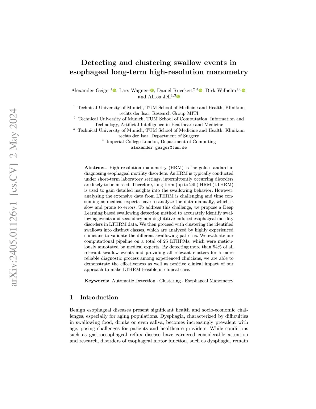 High-resolution manometry (HRM) is the gold standard in diagnosing esophageal motility disorders. As HRM is typically conducted under short-term laboratory settings, intermittently occurring disorders are likely to be missed. Therefore, long-term (up to 24h) HRM (LTHRM) is used to gain detailed insights into the swallowing behavior. However, analyzing the extensive data from LTHRM is challenging and time consuming as medical experts have to analyze the data manually, which is slow and prone to errors. To address this challenge, we propose a Deep Learning based swallowing detection method to accurately identify swallowing events and secondary non-deglutitive-induced esophageal motility disorders in LTHRM data. We then proceed with clustering the identified swallows into distinct classes, which are analyzed by highly experienced clinicians to validate the different swallowing patterns. We evaluate our computational pipeline on a total of 25 LTHRMs, which were meticulously annotated by medical experts. By detecting more than 94% of all relevant swallow events and providing all relevant clusters for a more reliable diagnostic process among experienced clinicians, we are able to demonstrate the effectiveness as well as positive clinical impact of our approach to make LTHRM feasible in clinical care.