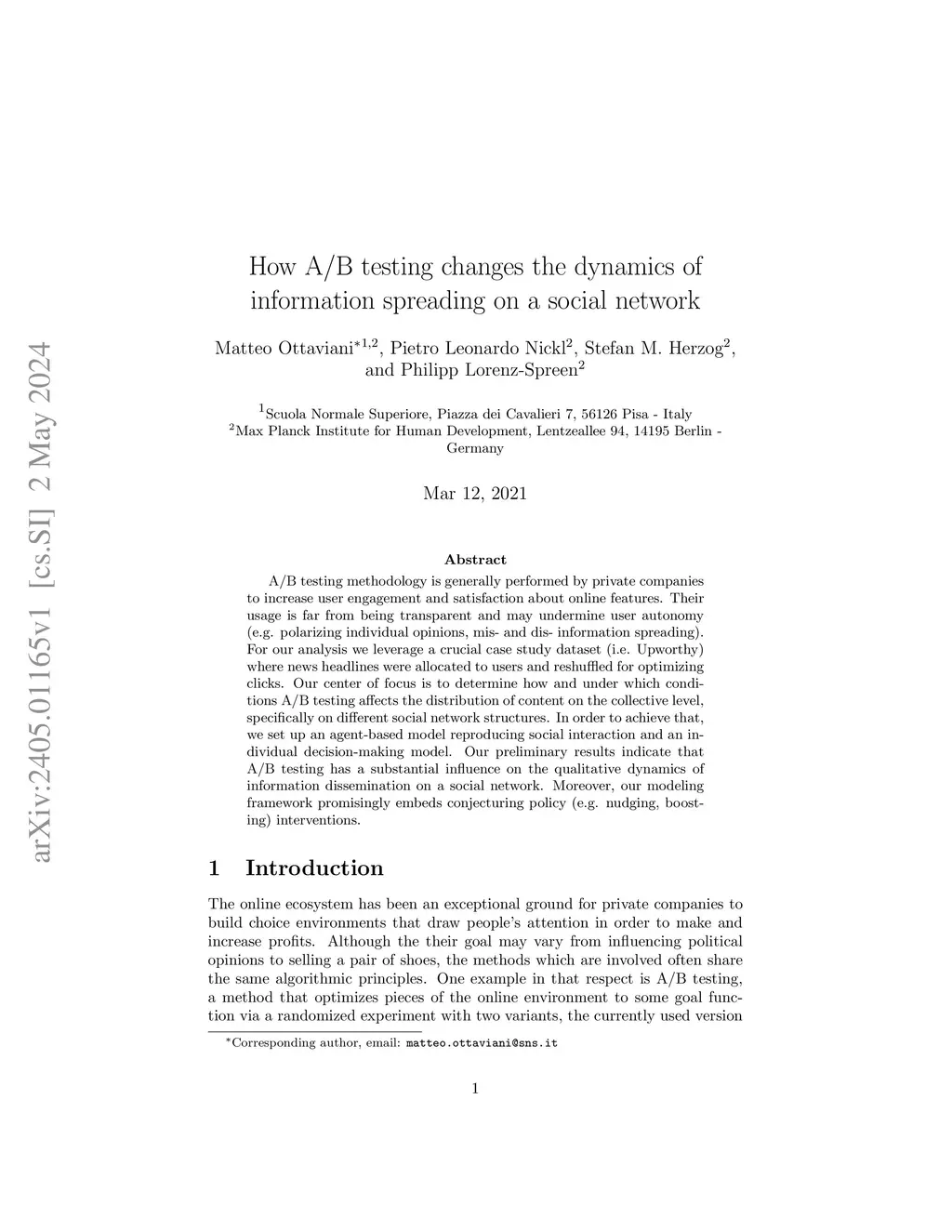 A/B testing methodology is generally performed by private companies to increase user engagement and satisfaction about online features. Their usage is far from being transparent and may undermine user autonomy (e.g. polarizing individual opinions, mis- and dis- information spreading). For our analysis we leverage a crucial case study dataset (i.e. Upworthy) where news headlines were allocated to users and reshuffled for optimizing clicks. Our centre of focus is to determine how and under which conditions A/B testing affects the distribution of content on the collective level, specifically on different social network structures. In order to achieve that, we set up an agent-based model reproducing social interaction and an individual decision-making model. Our preliminary results indicate that A/B testing has a substantial influence on the qualitative dynamics of information dissemination on a social network. Moreover, our modeling framework promisingly embeds conjecturing policy (e.g. nudging, boosting) interventions.